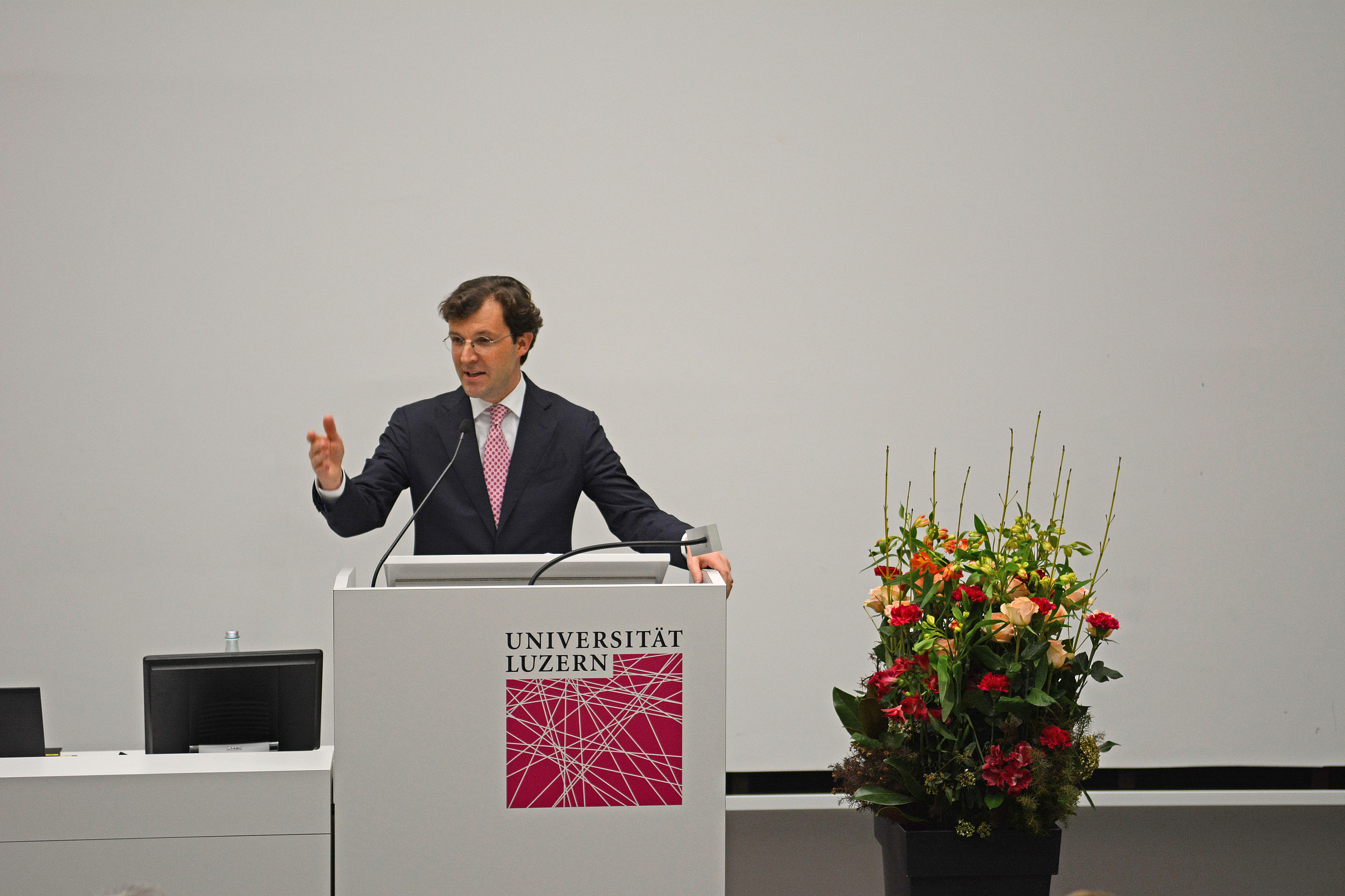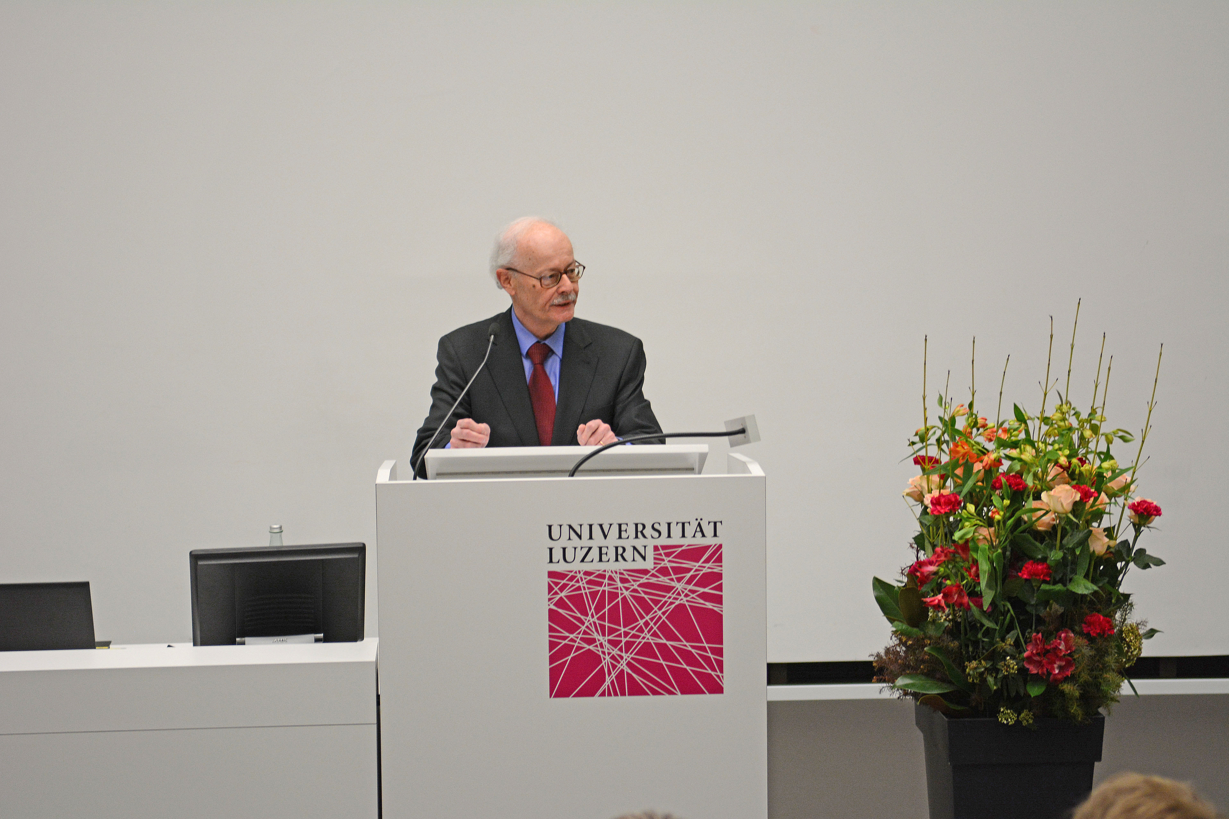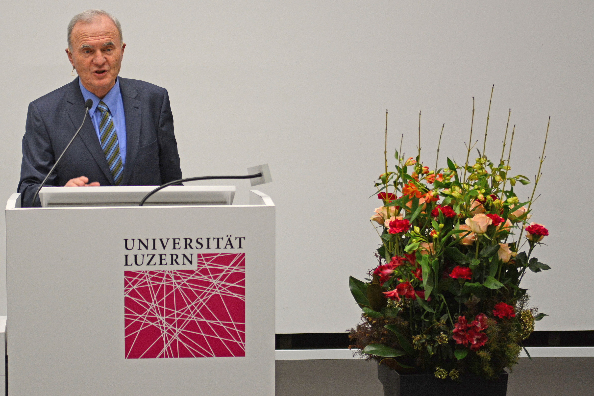 Prof. Dr. Christoph A. Schaltegger begrüsst die über 200 Zuhörerinnen und Zuhörer.
