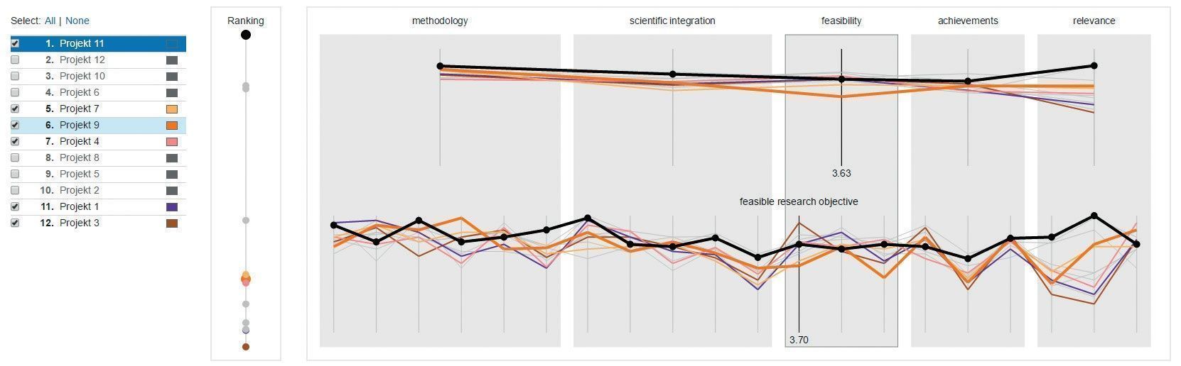 Die an der Universität Luzern durchgeführte und vom Akademischen Direktor Dr. Wolfgang Schatz geleitete und von Dr. Silvia Martens durchgeführte Studie "Ressourcenbasiertes Instrument zur Abbildung geisteswissenschaftlicher Forschung am Beispiel der Theologie" (Laufzeit: Juni 2013 bis Juni 2017) untersucht, wie die Forschung in der Theologie auf geeignete Weise abgebildet und sichtbar gemacht werden kann. Die erste Phase bestand darin, im Austausch mit den Forschenden in den theologischen Fakultäten der Schweiz ein Kriterienset für die Beurteilung der Qualität theologischer Forschung zu erarbeiten. In einem zweiten Schritt wurde darauf aufbauend in Zusammenarbeit mit der "Fachhochschule Nordwestschweiz – Hochschule für Life Sciences" eine Software zum Vergleich von Forschungsprojekten, Forschenden und Forschungseinrichtungen entwickelt, die zur Beurteilung der Forschungsqualität und zur Visualisierung von Forschungsprofilen dient (siehe Diagramm unten). Als weiteres Ergebnis der Studie werden Empfehlungenfür die Gestaltung von Evaluationsprozessen und den Umgang mit verschiedenen Kriterien und Instrumenten zur Beurteilung der Qualität der Forschung formuliert und auf der Projektwebseite veröffentlicht.