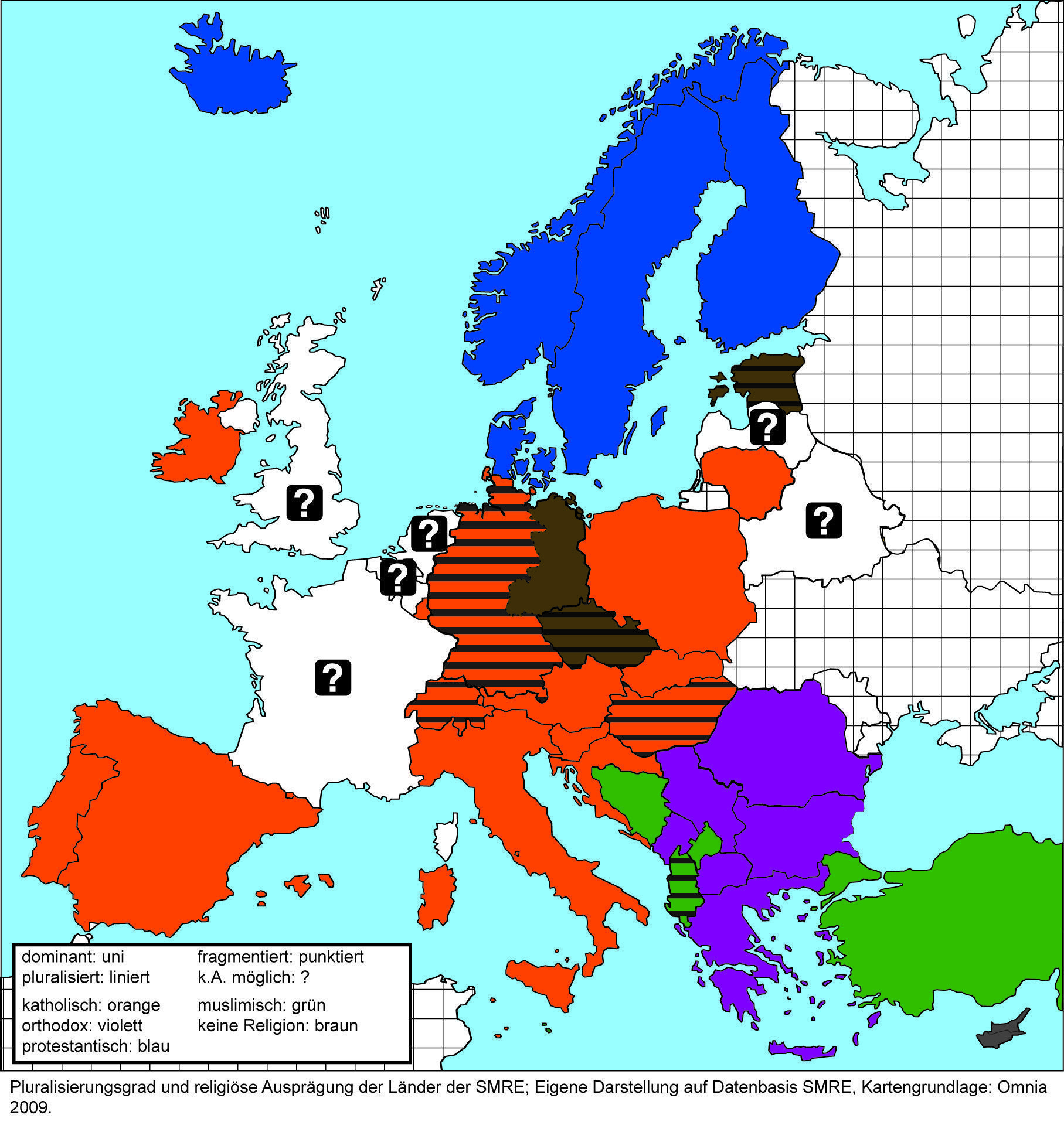 Die Zahlen der SMRE zeigen, dass für rund sieben Länder Europas, darunter Frankreich, die Niederlande und Grossbritannien, die Datenlage derzeit so widersprüchlich ist, dass man für sie keine gesicherten Aussagen treffen kann. Bei diesen Ländern handelt es sich also um "weisse Flecken" auf der religiösen Landkarte Europas (vgl. die Karte). In fast allen anderen Ländern ist eine einzelne religiöse Tradition dominant, das heisst, es zählen sich jeweils mehr als 60% der Bevölkerung zu einer bestimmten Religionsgemeinschaft. Rund drei Viertel der Länder Europas sind von einer christlichen Tradition geprägt. Die Schweiz gehört neben Ungarn, Albanien, Estland und Tschechien zu den wenigen Ländern, die pluralisiert sind: Zur jeweils grössten religiösen Gruppe, das heisst im Fall der Schweiz zur römisch-katholischen Kirche, zählen sich mehr als 35%, aber weniger als 60% der Bevölkerung.