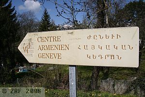 A droite, sur le parvis de l'église, un mémorial en souvenir du génocide du peuple arménien a été érigé. Derrière l'église, se dresse le centre arménien de Genève. Il s'agit d'un bâtiment cubique de couleur rouge-terre qui s'inscrit bien dans le paysage agricole.