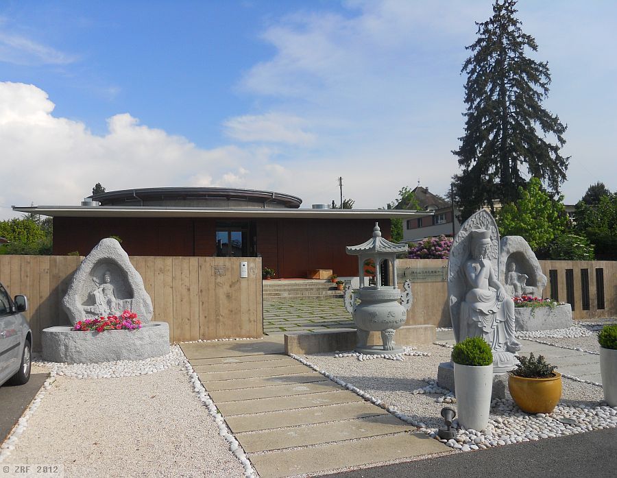Gare de Cointrin à Genève − bien que nous ne prenions pas l'avion pour l'Orient, nous allons quand même bientôt nous trouver devant un temple bouddhiste. Il suffit, pour ce faire, de monter «à bord» du bus numéro 10, direction «Balexert». Nous descendons du véhicule à la station «Terroux» et traversons la très fréquentée avenue Louis-Casaï. Puis, nous nous engageons en direction de Saconnex, dans le chemin Terroux. Après 10 minutes de marche, nous remarquons sur notre droite un bâtiment moderne avec un large escalier d'entrée et une esplanade pavée de dalles de pierre.