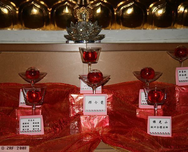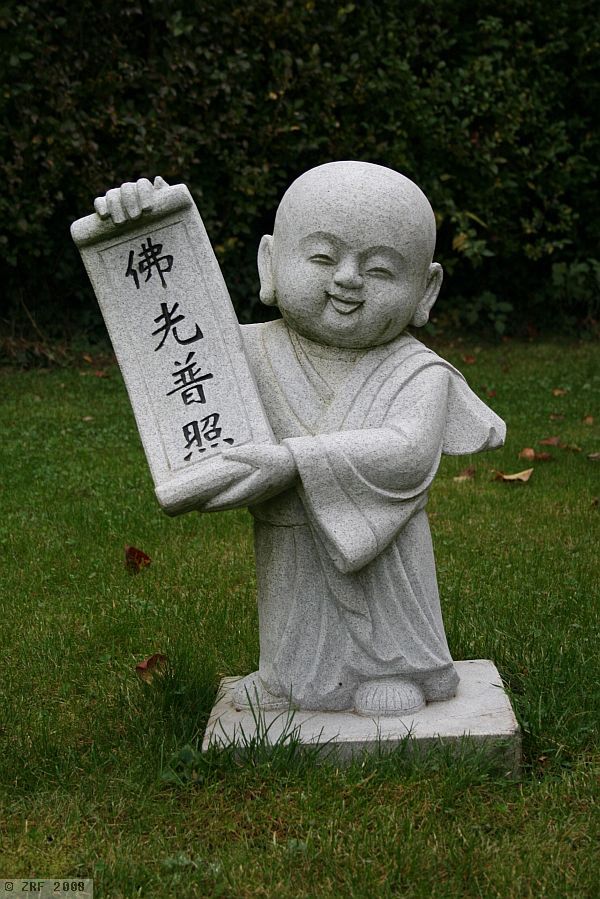 Sur les côtés de l'édifice se dressent des arbres décoratifs rares. Des figures de granite clair, un peu plus grandes que des nains de jardin, entourent le bâtiment et nous souhaitent la bienvenue. Elles représentent des novices bouddhistes. L'un d'entre eux tient une rouleau de papier sur lequel est inscrit en écriture chinoise: «La lumière du Bouddha brille partout». Un autre pratique le kung-Fu afin d'exercer son attention (mindfulness), comme la vénérable nonne Chue Yann va bientôt nous l'expliquer.
