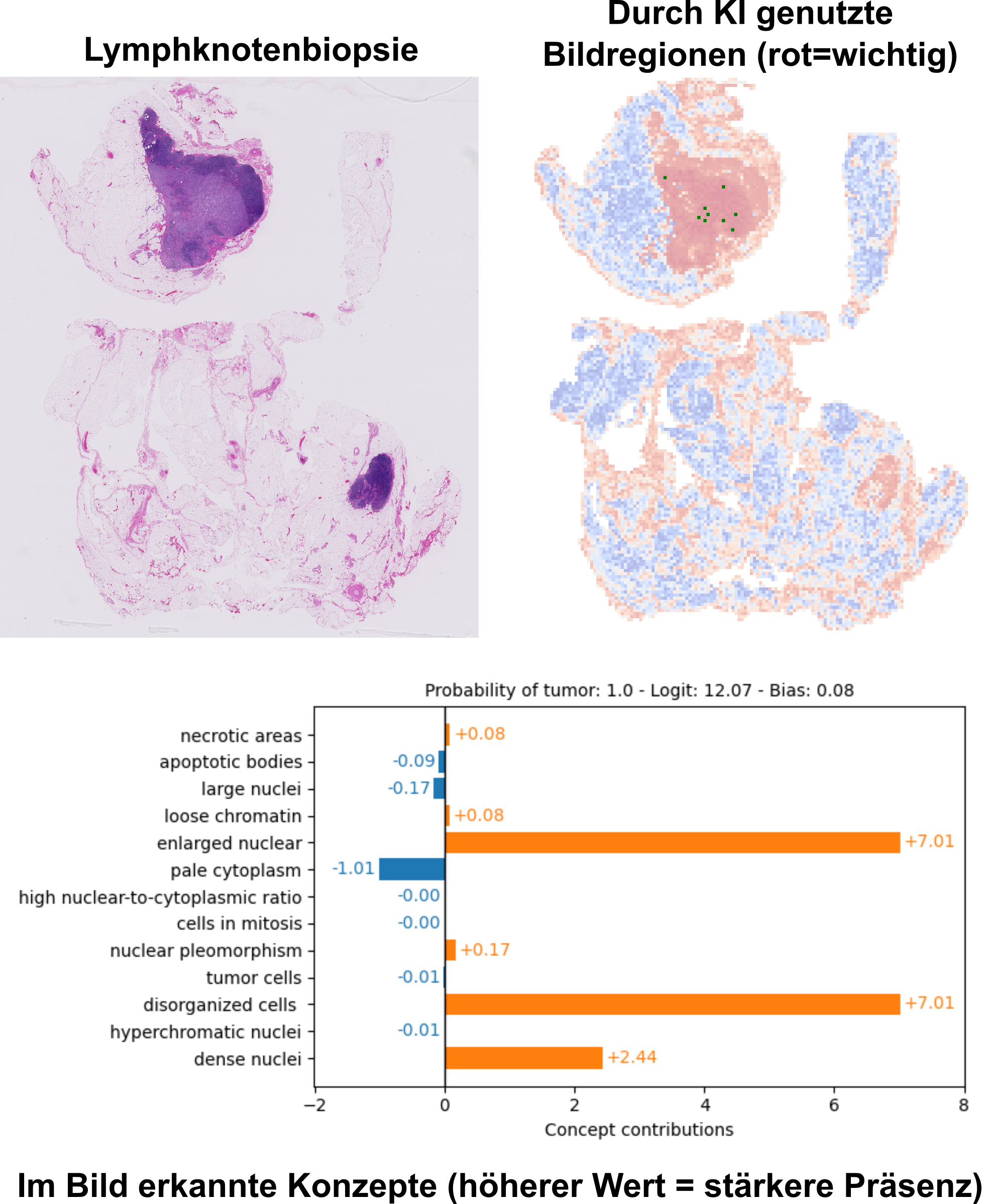 Bestehende KI-gestützte Systeme sind bereits in der Lage, verdächtige Regionen in Bildern zu markieren, können jedoch nicht erklären, weshalb diese Bereiche als auffällig gelten. Das neue System geht einen Schritt weiter: Es liefert Pathologinnen und Pathologen nachvollziehbare Erklärungen in verständlicher Sprache. So kann die KI beispielsweise darauf hinweisen, dass eine Region aufgrund von nekrotischem (abgestorbenem) Gewebe oder vergrösserten Zellkernen verdächtig erscheint.