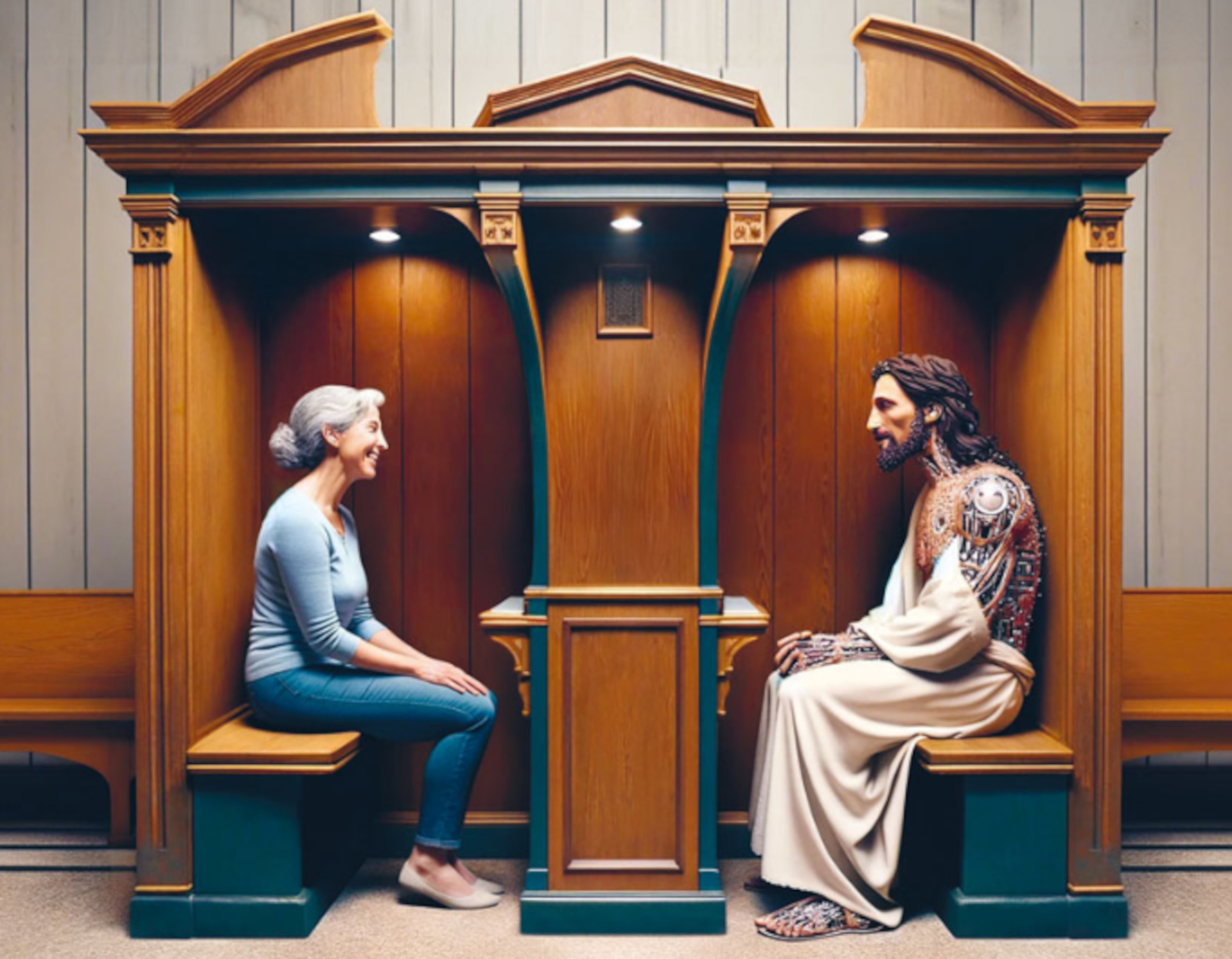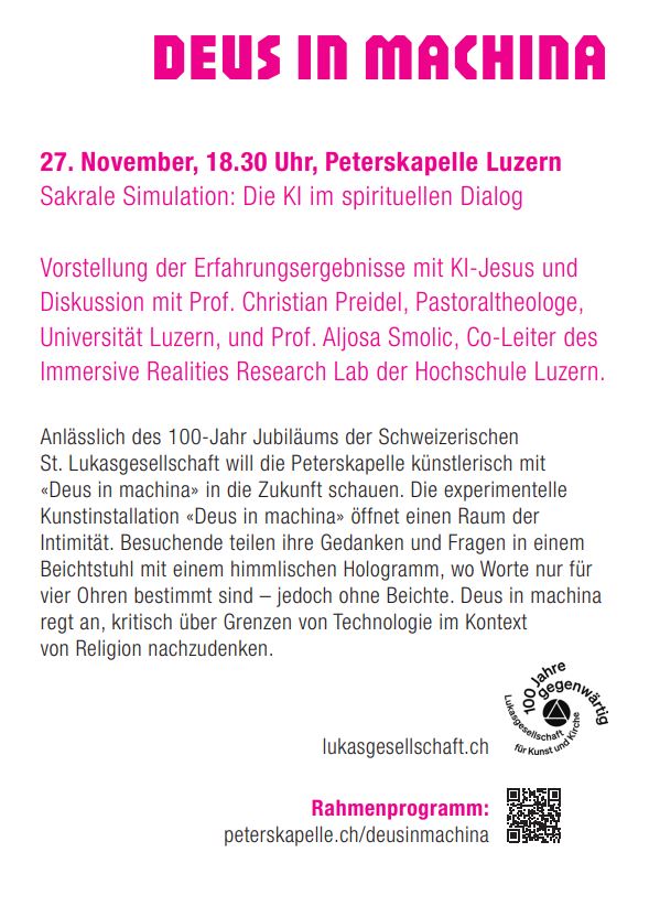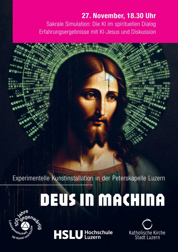Bis Ende Oktober konnten Besucher*innen der Peterkapelle in Luzern Teil der experimentellen Kunstinstallation «Deus in Machina» werden. Das künstlerische Team um Philipp Haslbauer und Aljosa Smolic (HSLU, Immersive Realities Research Lab) und Marco Schmid (Peterskapelle) platzierte im Beichtstuhl der Peterskapelle einen «KI-Jesus». 900 Besucher*innen nutzen die Gelegenheit «mit einer künstlichen Intelligenz (KI) zu sprechen und Antworten, basierend auf dem Neuen Testament, zu erhalten. Sie erlebten dabei eine jesus-ähnliche Gestalt auf einem Bildschirm».