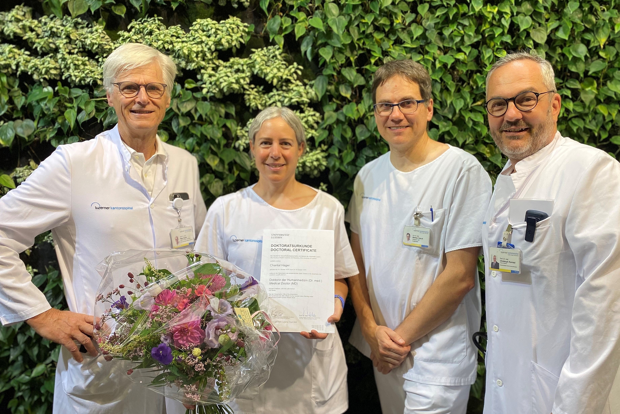 Die Universität Luzern bietet seit dem Frühjahr 2022 das Doktorat in Humanmedizin (Dr. med.) an. Chantal Hager – Oberärztin Anästhesie am Luzerner Kantonsspital (LUKS) – durfte Mitte Juli 2023 ihr Diplom entgegennehmen. Dieses wurde von Prof. Dr. med. Reto Babst, Prodekan Medizin und Medizinische Wissenschaften der Universität Luzern und Prof. Dr. med. Christoph Konrad, Departementsleiter klinische Querschnittsmedizin und Chefarzt Anästhesie übergeben.