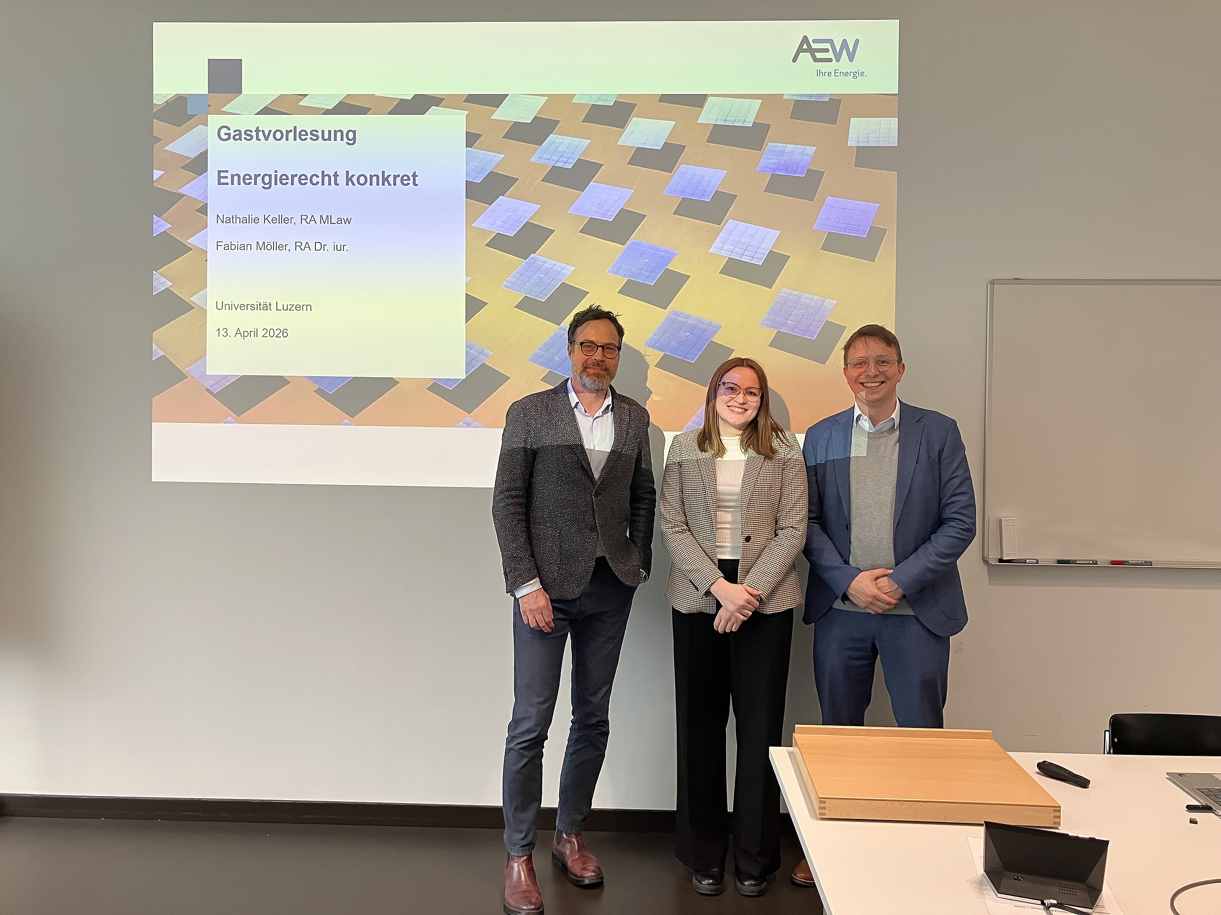 Im Rahmen der Masterveranstaltung Energierecht durfte Prof. Dr. iur. Max Baumgart am 13.04.2026 eine besondere Gastvorlesung ankündigen: RA Dr. iur. Fabian Möller sowie RA MLaw Nathalie Keller von der AEW Energie AG gewährten den Studierenden spannende Einblicke in die Praxis der Energiewirtschaft.