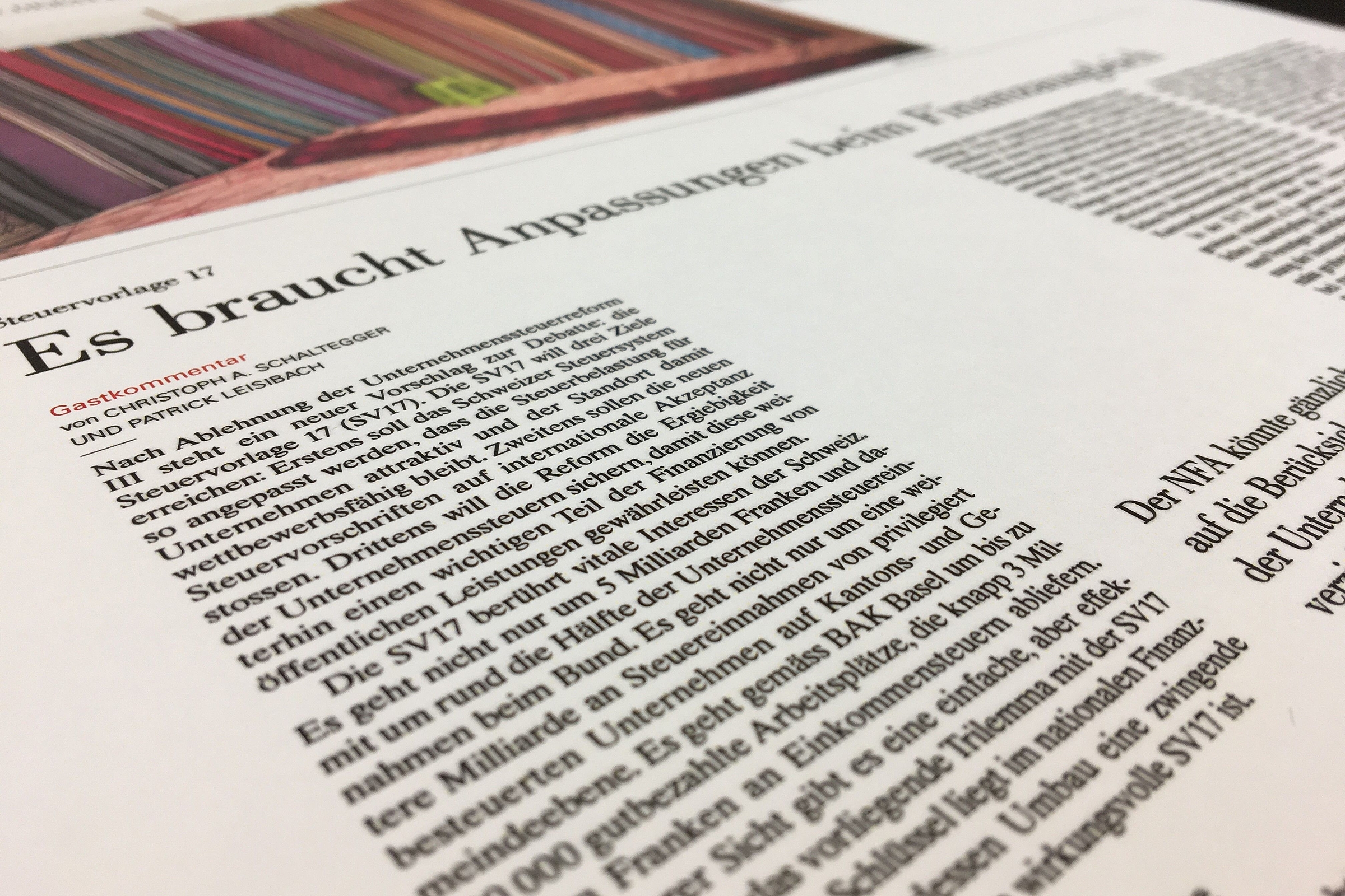 Für eine wirksame Steuervorlage 17 braucht es Anpassungen im Finanzausgleich, schreiben Prof. Dr. Christoph A. Schaltegger und Doktorand Patrick Leisibach in einem Gastkommentar in der NZZ.
