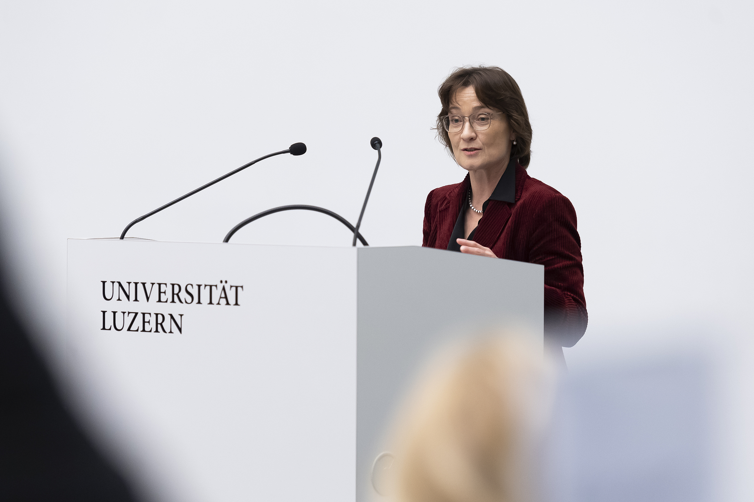 Ein bis auf den letzten Platz gefüllter Hörsaal unterstrich die Aktualität dieser Ausgabe der «Presidential Lectures». Aufgrund des eskalierenden Nahostkonflikts verschärfte sich die geopolitische Sicherheitslage zuletzt – einmal mehr – drastisch. Es sind Tage, in denen die internationale Diplomatie auf Hochtouren läuft. Vor diesem Hintergrund erhielt das Referat von Botschafterin Pascale Baeriswyl an der Vorlesungsreihe der Universität Luzern am 26. Oktober zusätzliches Gewicht. Die Baslerin ist Chefin der Ständigen Mission der Schweiz bei den Vereinten Nationen in New York. Weil die Schweiz seit Januar 2023 erstmals als eines von zehn gewählten Mitgliedern im Uno-Sicherheitsrat wirkt, befindet sich Baeriswyl direkt am Puls des Geschehens. Umso spannender waren die Einblicke, die sie dem Luzerner Publikum bot.