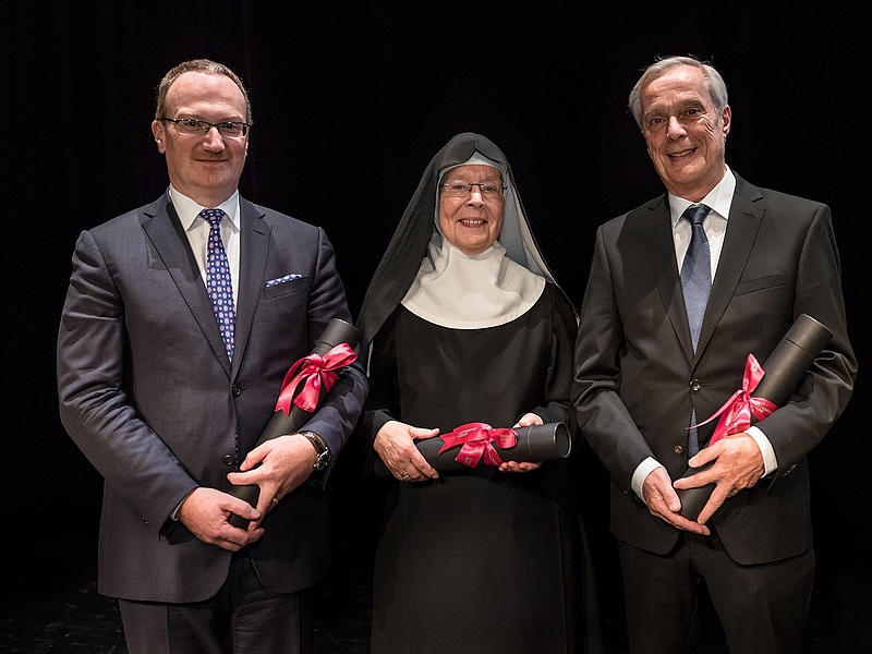 Mit der Ehrendoktorwürde wurden Sr. Dr. Michaela Puzicha OSB, Dr. Lorenz Erni und Prof. Dr. Lars P. Feld bedacht (mehr Informationen in der Medienmitteilung). Der Credit Suisse Award for Best Teaching ging an Prof. Dr. Regina Aebi-Müller, Professorin für Privatrecht und Privatrechtsvergleichung. Der Universitätsverein verlieh seine Dissertationspreise an Dr. Viktoria Vonarburg, Dr. des. Daniel Thieme und Dr. Josianne Magnin.