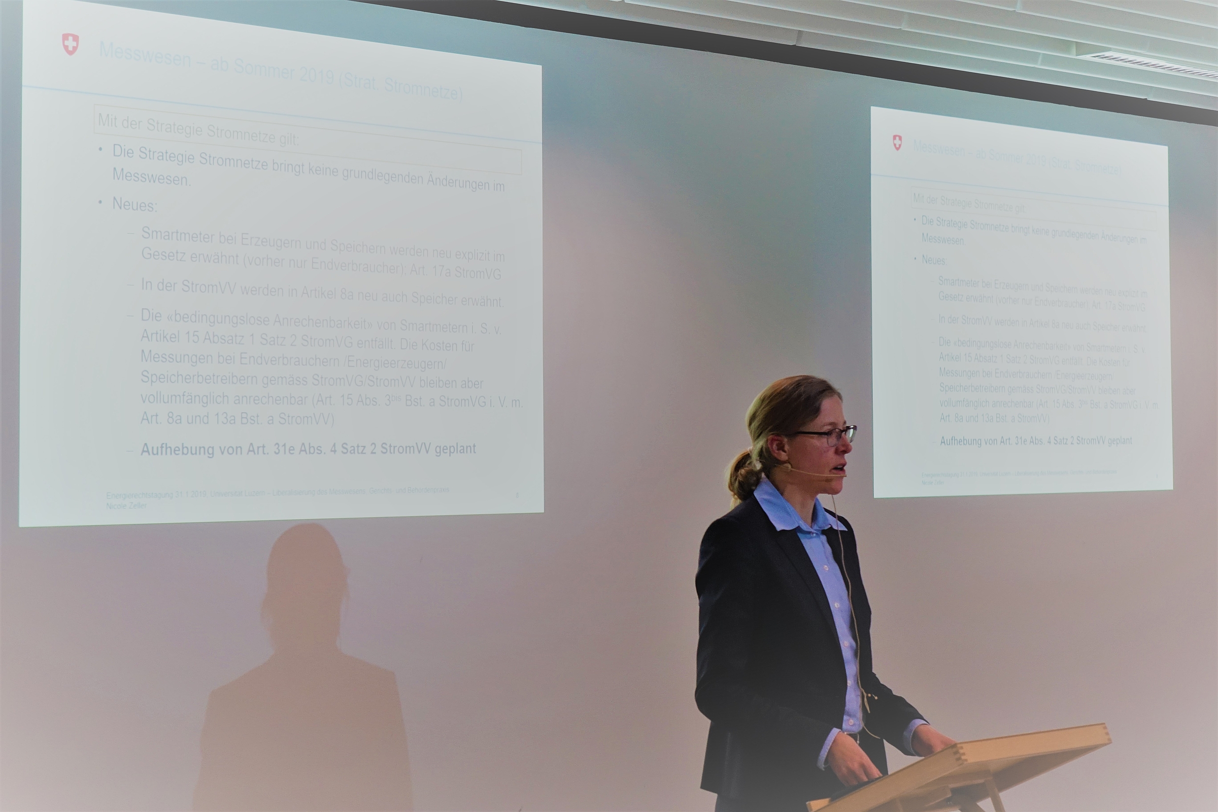 Wettbewerbsfragen blieben auch anschliessend Thema, als Nicole Zeller, Leiterin Sektion Recht im Fachsekretariat der ElCom, die Gerichts- und Behördenpraxis zur Liberalisierung des Messwesens analysierte. Dabei stellte sie zunächst fest, dass sich das Bundesgericht in BGE 143 I 395 explizit nur zur Liberalisierung in einem Teilbereich des Messwesens geäussert habe. Der Entscheid betreffe lediglich Produzenten mit einer Anschlussleistung > 30 kVA. Die Liberalisierung des Messstellenbetriebs oder der Mess-Dienstleistungen für Endverbraucher habe das Bundesgericht nicht behandelt. Sodann erläuterte sie den Smart Meter Rollout und die Anrechenbarkeit der damit verbundenen Kosten. Nach neuem Recht bestünde schliesslich kein Raum mehr für eine freie Wahl des Messdienstleisters im Sinne des Bundesgerichtsentscheids, soweit nicht die Ausnahmeregelung für vor 2018 eingesetzte Lastgangmessungen betroffen sei. Erst im Zuge der Revision des Stromversorgungsgesetzes sei eine Teilliberalisierung des Messwesens angedacht