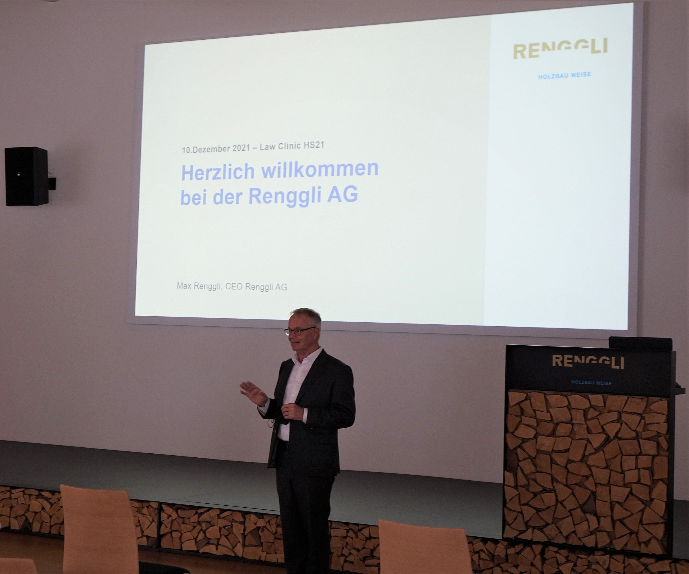 Die Teilnehmerinnen und Teilnehmer der Law Clinic Wirtschaftsrecht fanden sich zur Abschlussveranstaltung auf dem Werksgelände der Renggli AG in Schötz ein. Die Renggli AG ist als Generalunternehmerin für private Bauherren und Investoren und als Partnerin von Architekten in der ganzen Schweiz tätig. Das Familienunternehmen, das nunmehr in der vierten Generation innovative, hochwertige Holzbauten mit hohem Vorfertigungsgrad herstellt, beschäftigt im In- und Ausland rund 250 Personen.