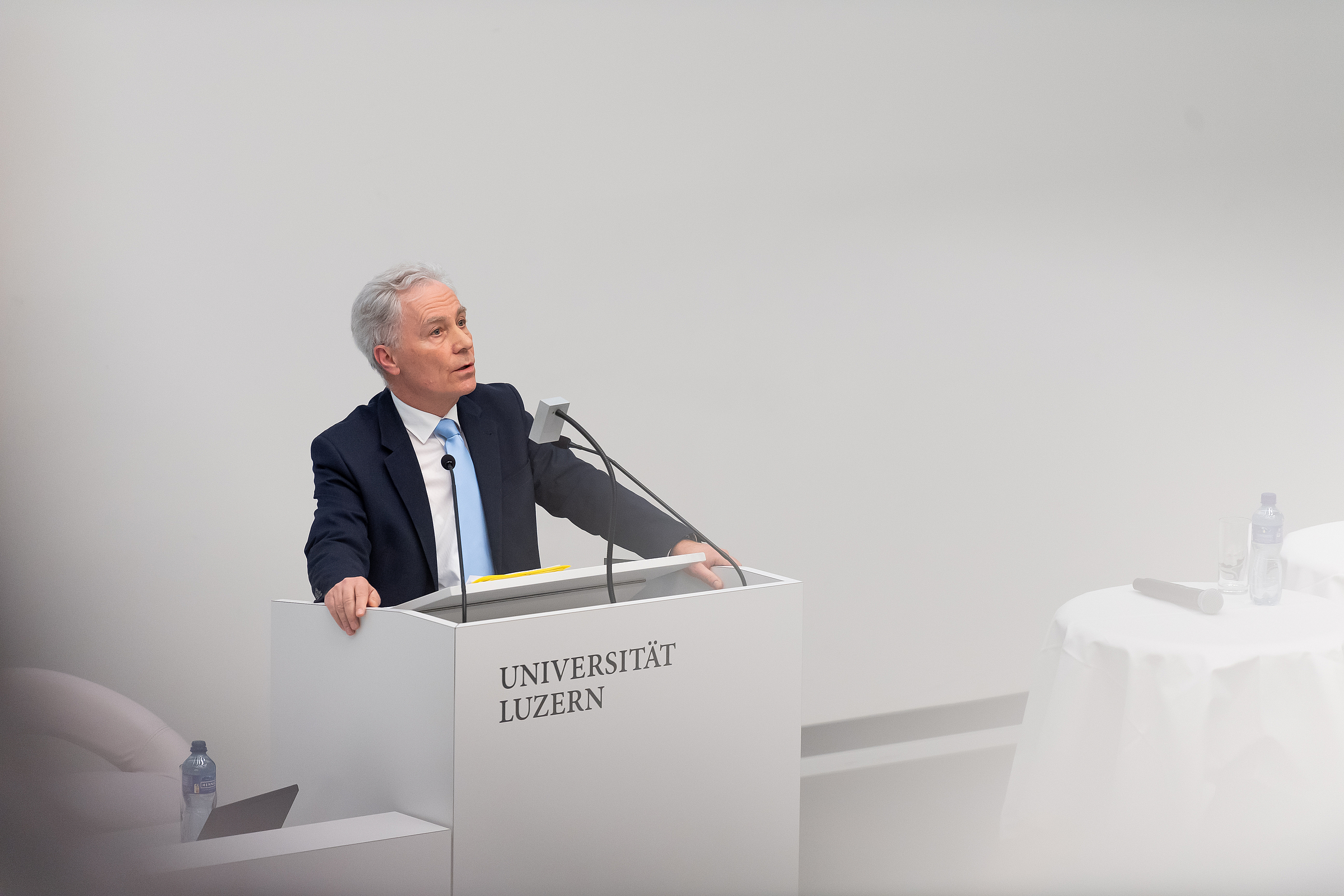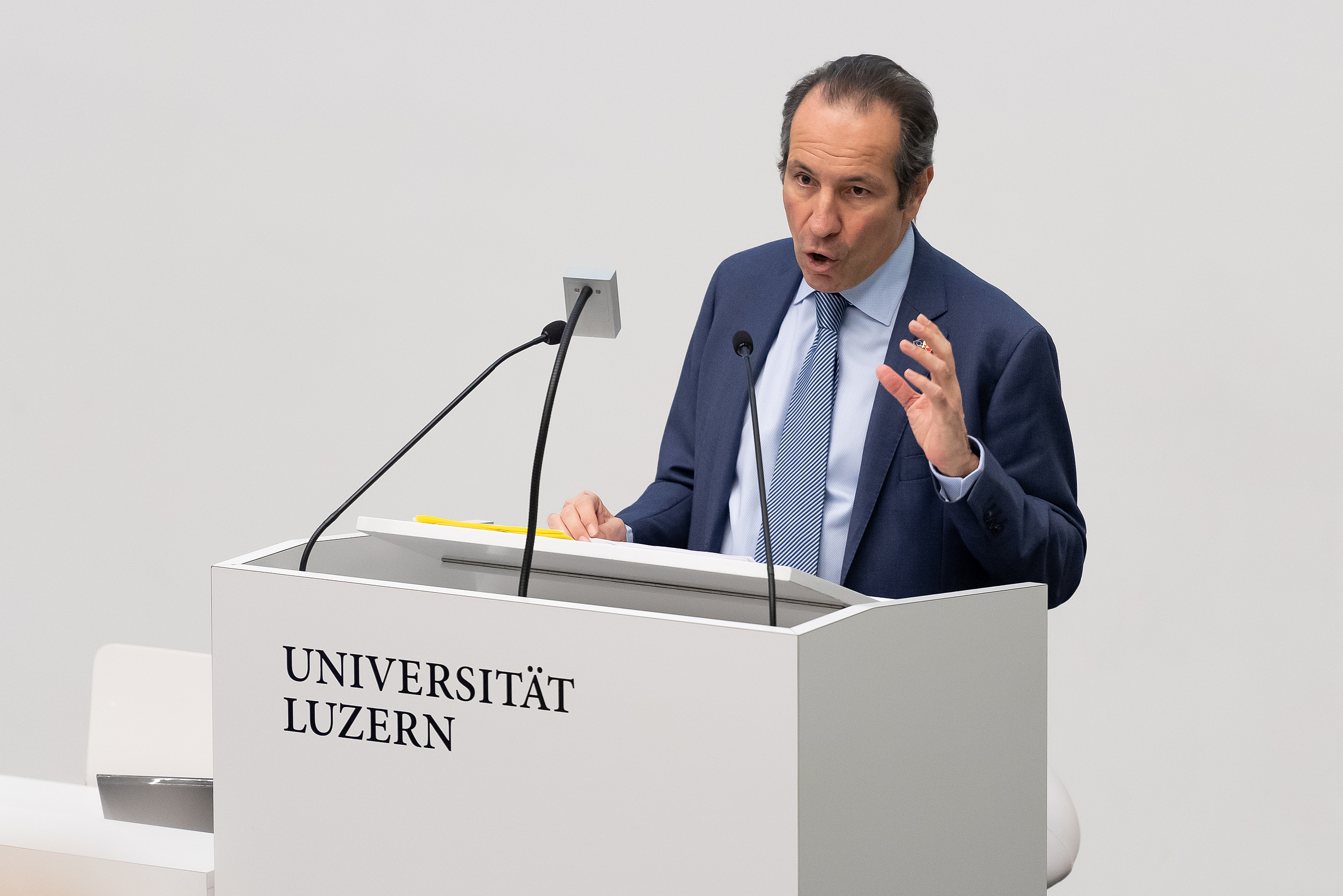 Luzern sei eine Brückenstadt, postulierte Rektor Bruno Staffelbach in seinem Willkommensgruss zur inzwischen dritten «Presidential Lecture» am 26. Januar. Und Brücken zu schlagen sei auch eine Funktion der Veranstaltungsreihe; sie werden geschlagen zwischen Wissenschaft und Gesellschaft, aber auch zwischen der Welt, Europa und der Schweiz. Zu Gast an der Universität Luzern war Petros Mavromichalis. Der Botschafter der Europäischen Union in der Schweiz und für das Fürstentum Liechtenstein hat in seinem Referat klare Worte gefunden dafür, wie der russische Angriffskrieg auf die Ukraine im vergangenen Jahr die EU geprägt hat. Die ohnehin hochrelevante Thematik hat in den vergangenen Tagen weiter an Dringlichkeit gewonnen, nachdem Deutschland und die USA entschieden haben, der Ukraine Panzer zu liefern.