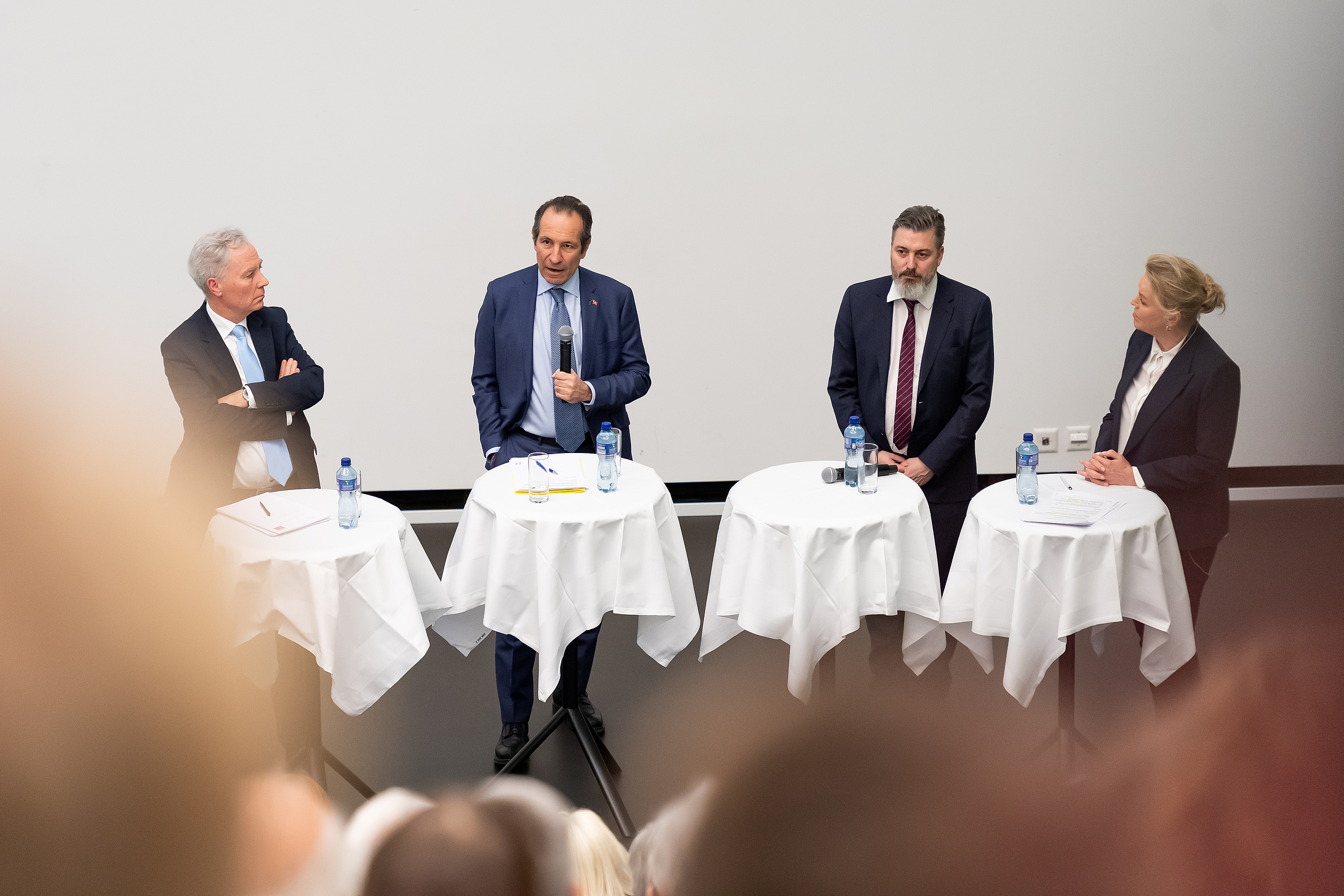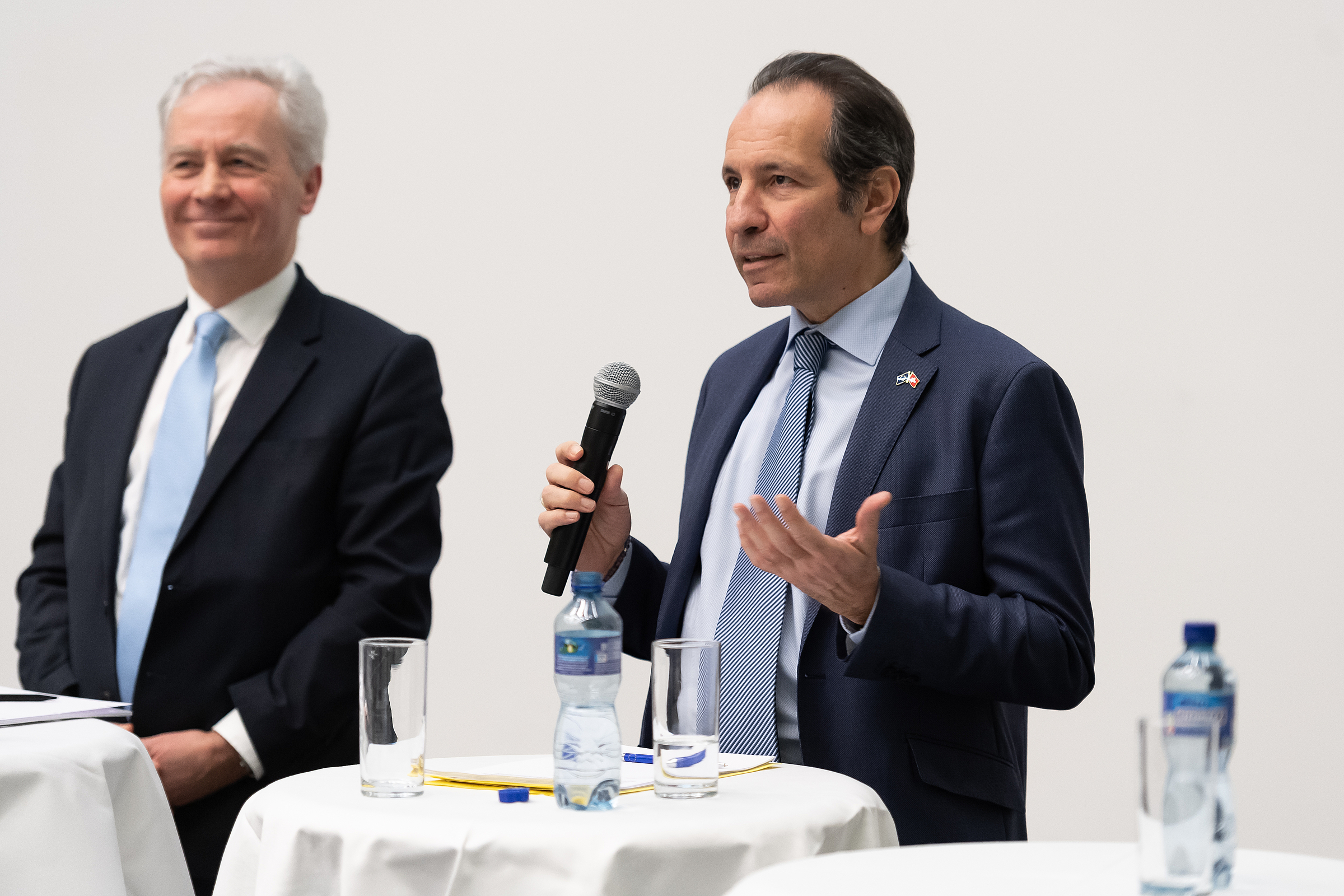 Im Anschluss an das Referat moderierte SRF-Journalistin Katja Stauber eine Diskussionsrunde mit dem Botschafter, an der sich auch Georg Häsler, Bundeshaus-Redaktor der NZZ für Sicherheitspolitik, sowie Rektor Bruno Staffelbach beteiligten – der zwischendurch auch auf sein Wissen als Brigadier zurückgreifen konnte. In dem Gespräch konnten nicht zuletzt Fragen aufgegriffen werden, die sich in den letzten Tagen durch die Zusage von Panzerlieferungen neu gestellt haben. Das immense Interesse der Anwesenden an den Perspektiven der EU spiegelte sich in zahlreichen spannenden Fragen aus dem Publikum.