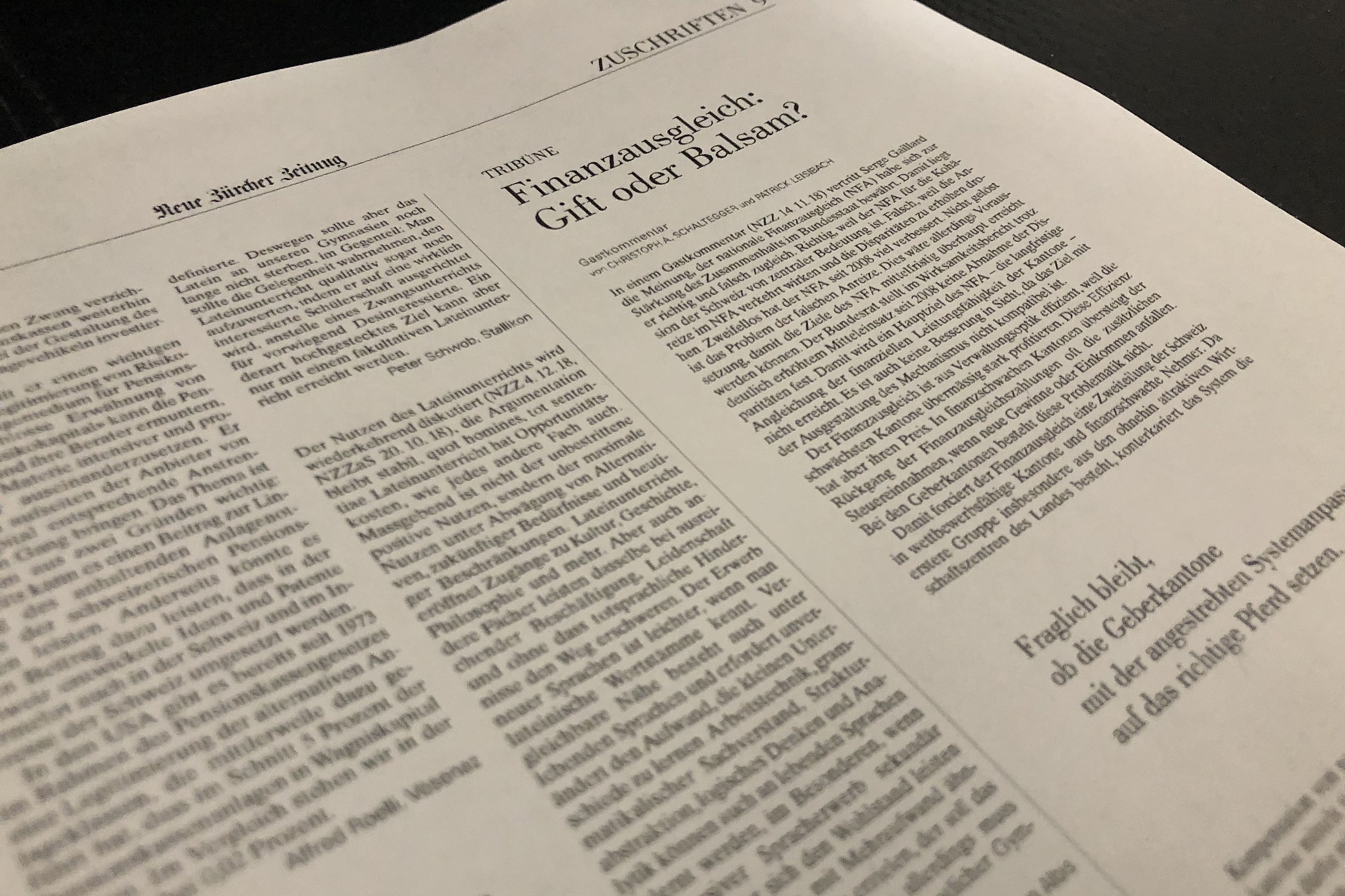 Prof. Dr. Christoph A. Schaltegger und Patrick Leisibach nehmen in einem Gastkommentar in der NZZ Stellung zum Nationalen Finanzausgleich.