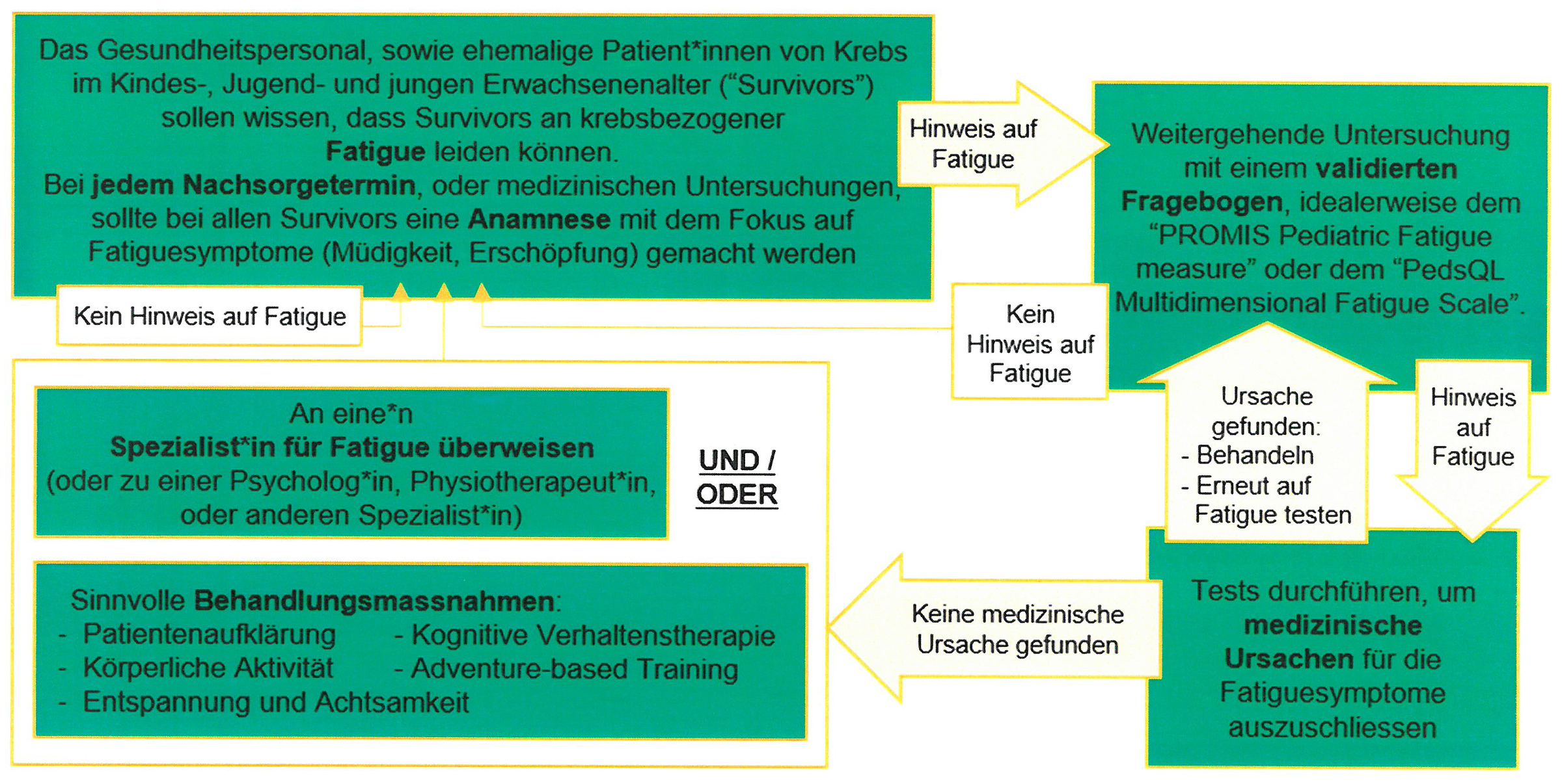 In den letzten Jahrzehnten hat sich die Behandlung von Krebs im Kindes- und Jugendalter stark verbessert. Der Grossteil der Patientinnen und Patienten kann geheilt werden, aber viele ehemalige Patienten ("Survivors", "Überlebende", genannt) leiden auch Jahre und Jahrzehnte später noch an Spätfolgen. Krebsbezogene Fatigue (chronische Müdigkeit im Zusammenhang mit der Krebserkrankung und -behandlung) ist eine häufige Spätfolge. Deshalb werden regelmässige Nachsorgeuntersuchungen empfohlen, um die Spätfolgen frühzeitig erkennen und behandeln zu können. Richtlinien für das Screening von Spätfolgen sind wichtig, um die Nachsorge passend zu gestalten.