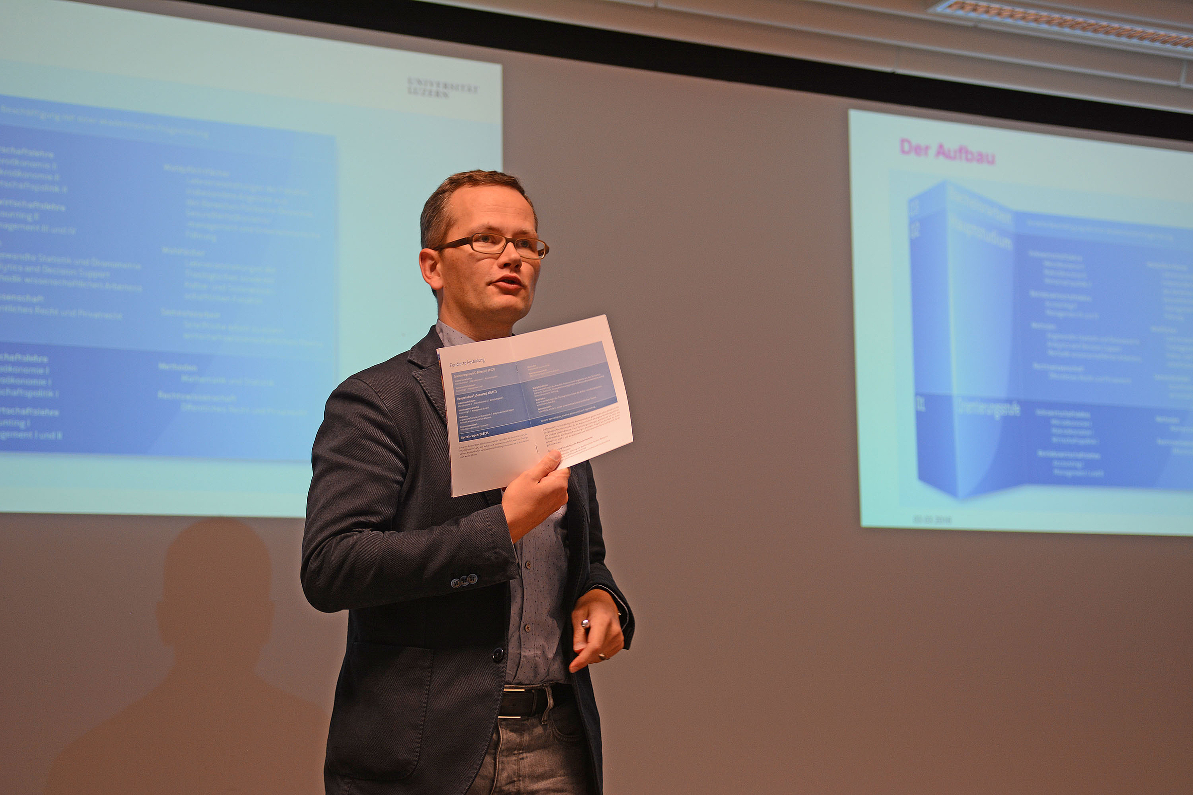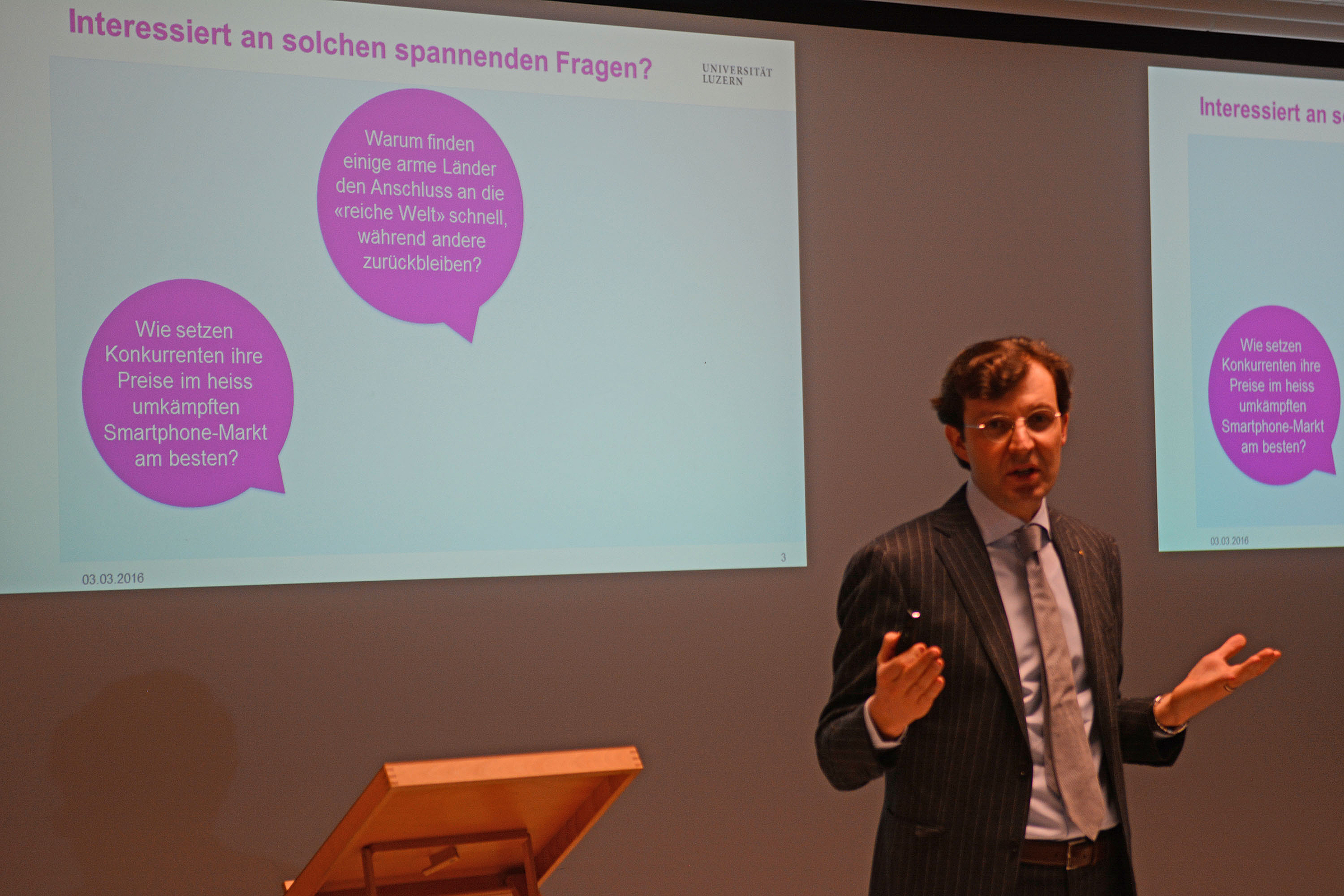"Was soll ich denn eigentlich studieren - und wo?" Solche Fragen beschäftigen zurzeit viele Maturandinnen und Maturanden. Die Wirtschaftswissenschaftliche Fakultät hat zum Informationsabend eingeladen und durfte 50 Interessierte an der Universität Luzern begrüssen. Die Besucher haben erfahren, mit welchen Fragen sich angehende Wirtschaftsstudierende im Studium in Luzern beschäftigen und warum gerade die Universität Luzern eine einmalige Chance für das Wirtschaftsstudium bietet.