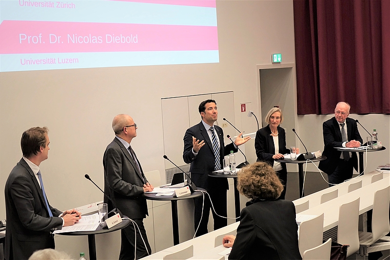 Was die beiden Inputreferate vorzeichneten, bestätigte sich in der anschliessenden Podiumsdiskussion, woran mit Prof. em. Dr. Roger Zäch sowie Ständerat und FDP-Vizepräsident Dr. Andrea Caroni zwei weitere illustre Gäste teilnahmen. Das Anliegen der Initiative erhält im Grundsatz zwar breiten Zuspruch, in Bezug auf die zur Umsetzung vorgesehenen Instrumente wie das Konzept der relativen Marktmacht und ihre Auswirkungen gehen die Meinungen aber stark auseinander. Im Verlauf des Abends musste dem Publikum klarwerden: Patentrezepte gegen die Hochpreisinsel scheint es nicht zu geben.
