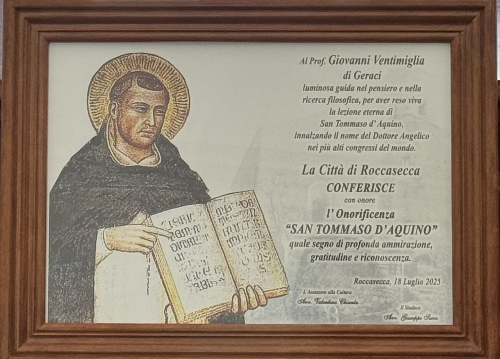 Al Professor GIovanni Ventimiglia di Geraci luminosa guida nel pensiero e nella ricerca filosofica, per aver reso viva la lezione eterna di san Tommaso d'Aquino, innalzando il nome del Dottore Angelico nei più alti congressi del mondo la Città di Roccasecca conferisce con onore l'Onorificenza «San Tommaso d'Aquino» quale segno di profonda ammirazione, gratitudine e riconoscenza
