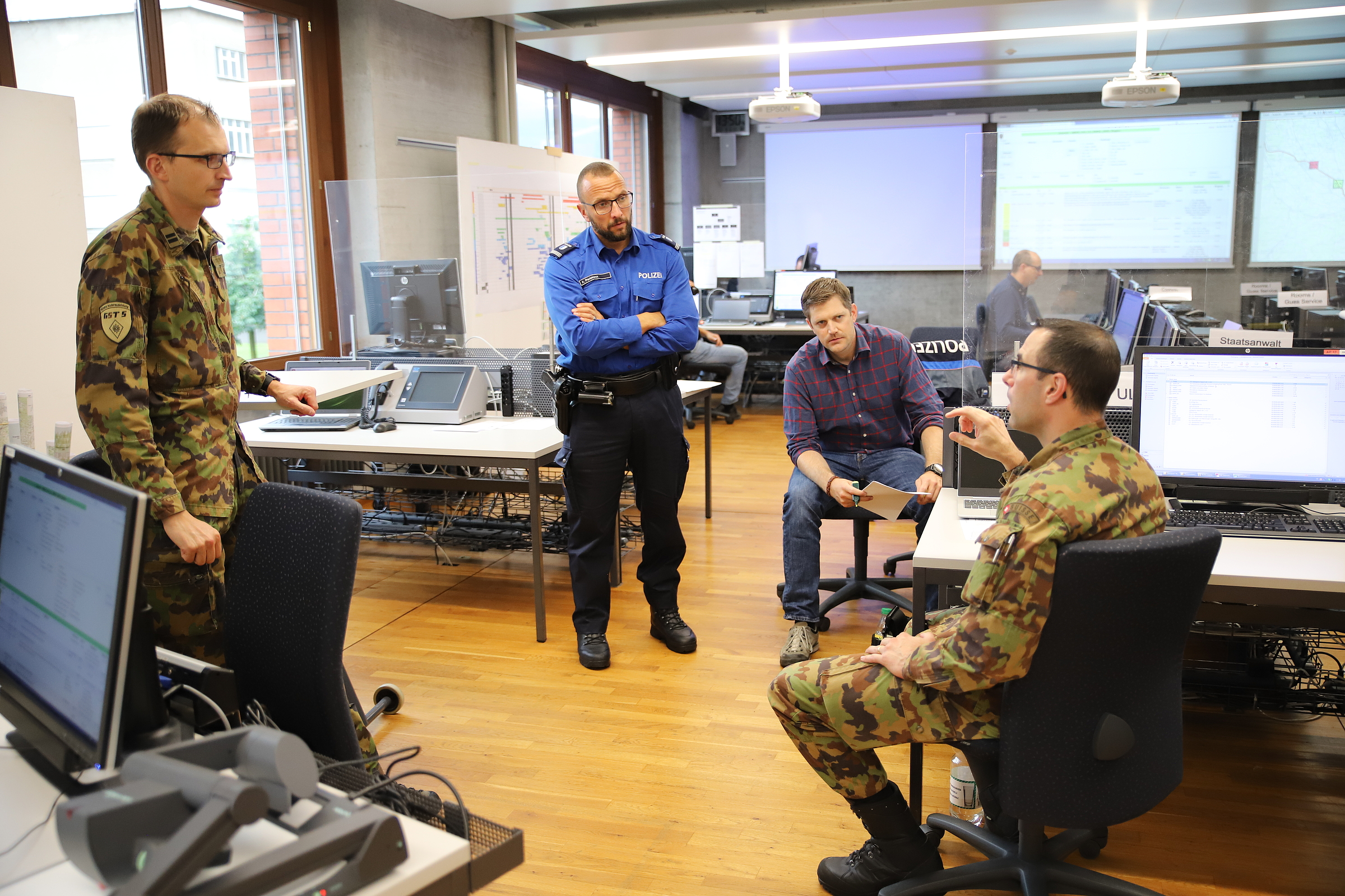 Eine Woche lang planten die Teilnehmenden gemeinsam das Grossereignis von internationaler Reichweite. In der folgenden Woche überprüften sie während vier Tagen die erstellte Planung auf dem Führungssimulator der HKA in Kriens. Wie zu erwarten, lief nicht alles rund und die Teilnehmenden mussten auf unvorhergesehene Ereignisse schnell und professionell reagieren. Die Übungsleitung hat im Szenario unter anderem Autounfälle, ungebetene Gäste, Falschmeldungen und sogar einen Todesfall eingebaut.