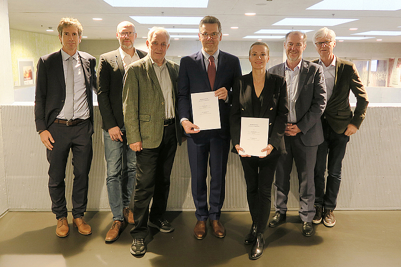 Prof. Dr. Bernhard Rütsche, Prof. Dr. Stefan Boes, Dr. Ulrich Fricker, Prof. Dr. Martin Hartmann, Prof. Dr. med. Katrin Hoffmann, Benno Fuchs und Prof. Dr. med. Reto Babst (v.l.) anlässlich der Vertragsunterzeichnung.