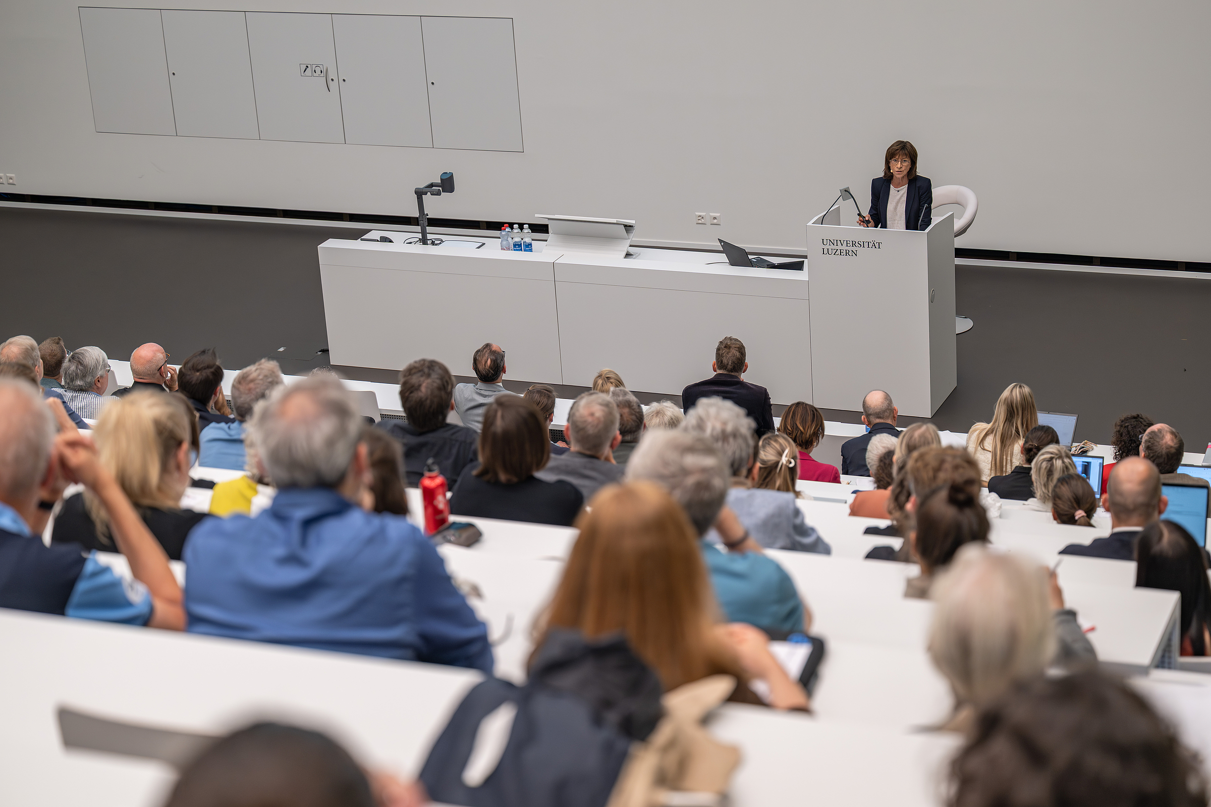 Heidi Hanselmann, Präsidentin der Schweizer Paraplegiker-Stiftung, zeigte in ihrem Vortrag, wie Menschen mit Querschnittlähmung mehr Selbstbestimmung und Inklusion ermöglicht werden soll. Die Veranstaltung bildete den Auftakt zur neuen Vortragsreihe «LIFE B. Braun Lectures» an der Universität Luzern.