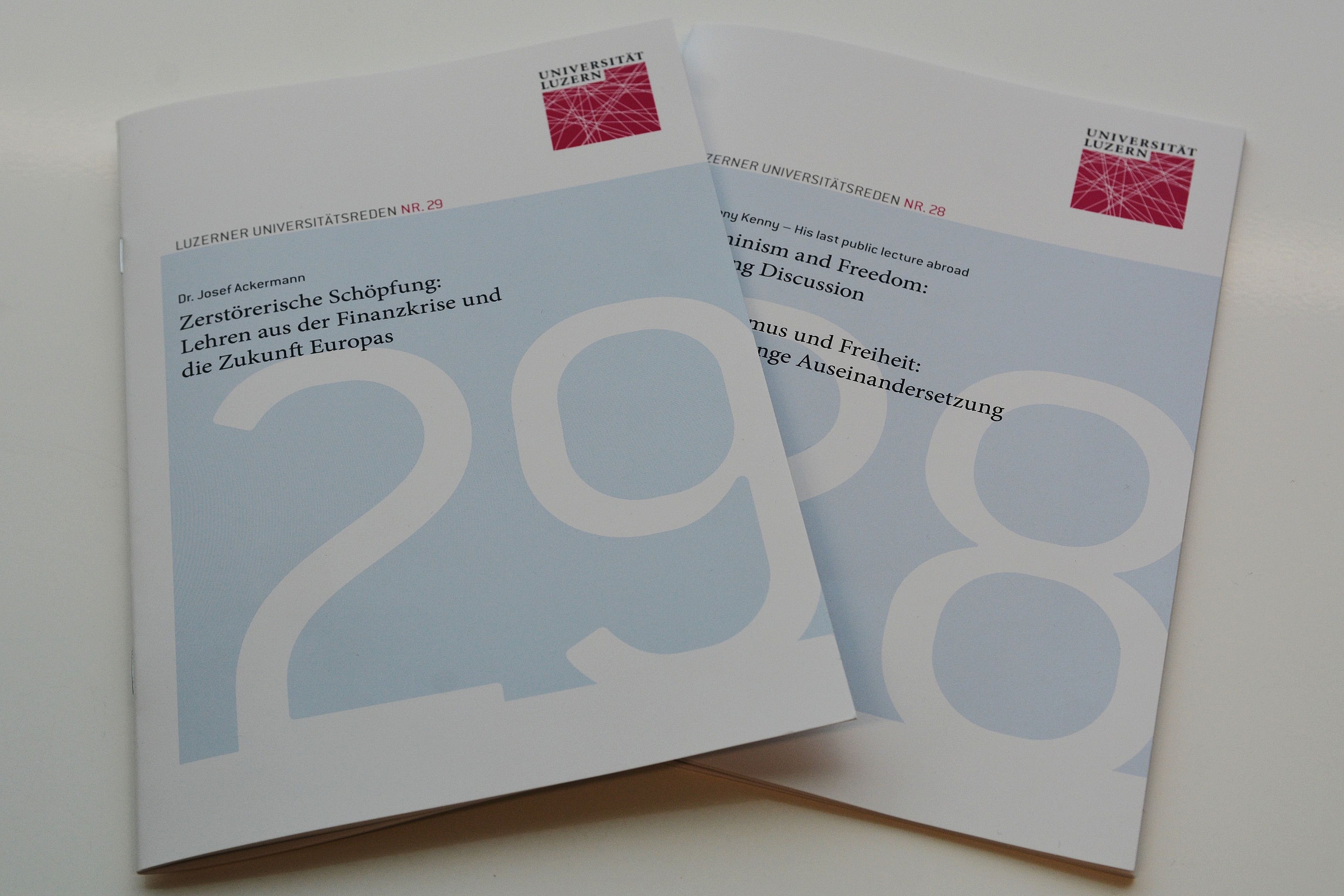 Mit "Determinism and Freedom: A Lifelong Discussion" von Sir Anthony Kenny sowie "Zerstörerische Schöpfung: Lehren aus der Finanzkrise und die Zukunft Europas" von Dr. Josef Ackermann sind zwei neue Luzerner Universitätsreden erschienen.