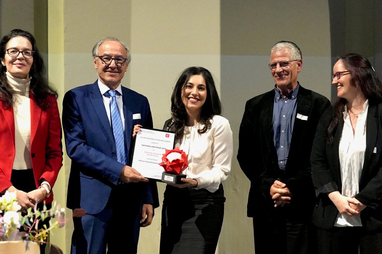 Die beiden Ausgezeichneten, Agatha Brandão (Mitte) und Daniel Girsberger (r. daneben), mit (v.l.) Jurymitglied Katerina Mitrokotsa, a+-Präsident Yves Flückiger und a+-Geschäftsführerin Marianne Bonvin Cuddapah (Bild: a+)