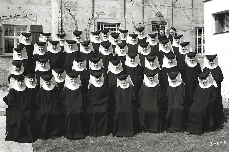 Konvent des Klosters Fahr. Die Schwestern tragen hier die vorkonziliarische Tracht. Diese wurde in der Folge des Zweiten Vatikanischen Konszils ab den 1970er-Jahren modernisiert und vereinfacht. (Bild: Archiv Kloster Einsiedeln)