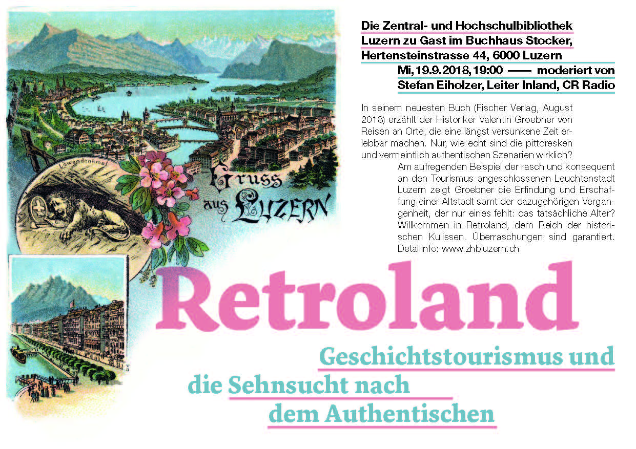 Am 19. September um 19.00 Uhr findet im Buchhaus Stocker eine Lesung und ein Gespräch zu Valentin Groebners neustem Buch "Retroland" statt. Der Historiker nimmt eine Sonderform des Tourismus unter die Lupe und betrachtet dabei auch die Erschaffung der Luzerner Altstadt.