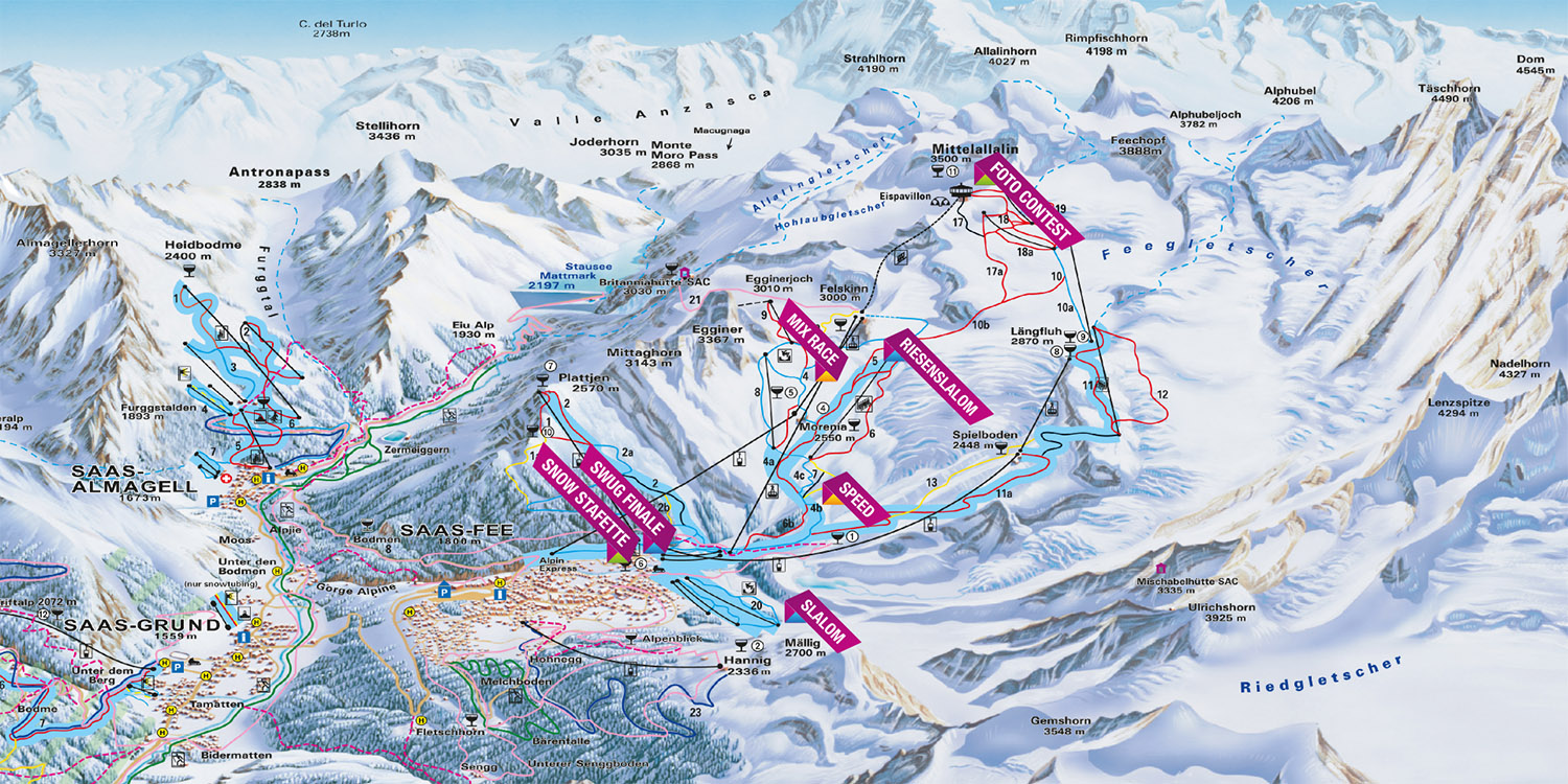 Die Disziplinen Riesenslalom, Slalom, Mix Race, Speed, Foto Contest, Snow Stafette, SWUG Finale werden auf den Anlagen des Adrenalin Cups in Saas-Fee ausgetragen. Dabei werden die Teilnehmerinnen und Teilnehmer automatisch gefilmt oder fotografiert. Die Bilder wie auch die Resultate können bereits kurz nach Abschluss der Disziplin über das Smartphone, im Internet oder an einem "racers corner" angeschaut werden.