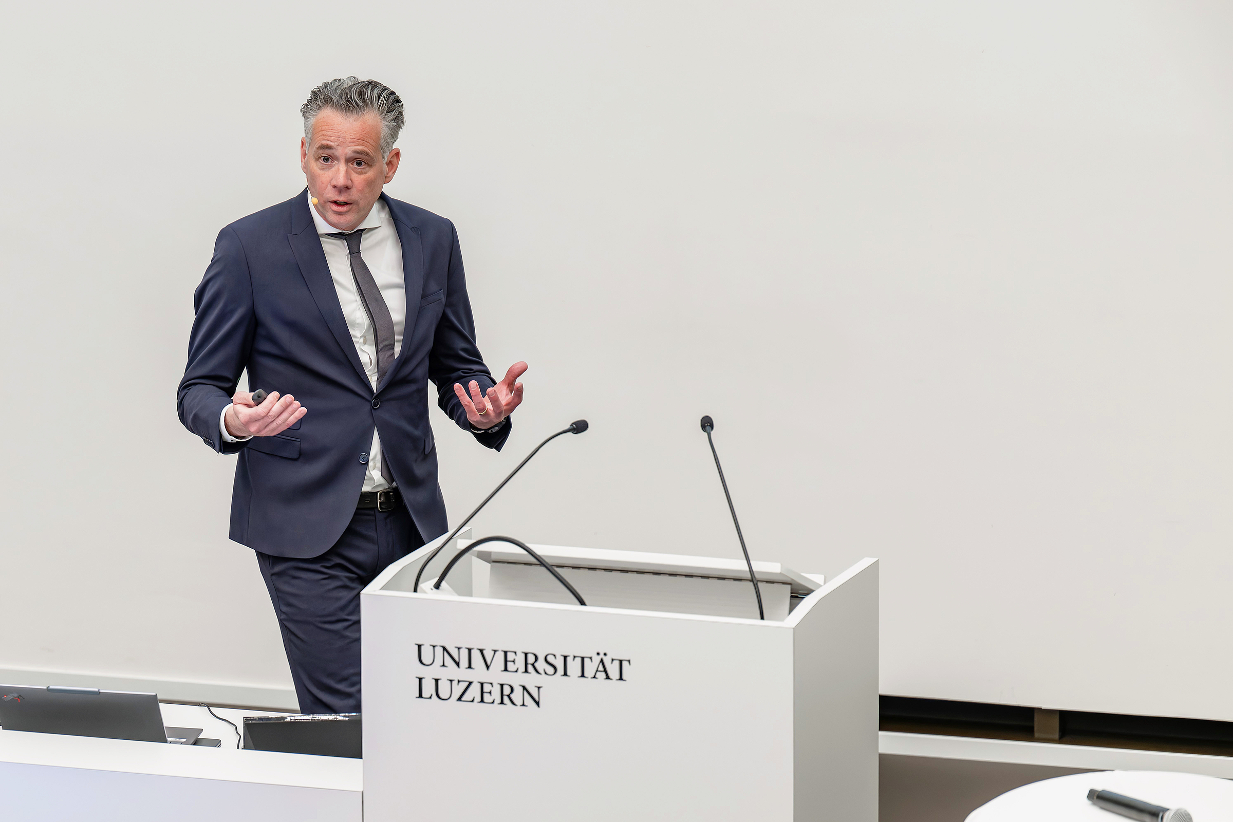 Die Schlussfolgerung am Ende des Referats vermittelt einen nachdenklich stimmenden Ausblick. Der aktuelle Anstieg an geopolitischen Spannungen werde uns sicher alle ein wenig ärmer machen, bilanziert Manuel Oechslin. Die geopolitische «Windstille» in der Zeit nach 1989 habe grosse Produktivitätsgewinne und mehr Wohlstand zur Folge gehabt. Nun stünden diese Errungenschaften von zwei Seiten unter Druck. Einerseits werde die Globalisierung durch «Decoupling» und die Marginalisierung der Blockränder zurückgedrängt, andererseits seien wohl höhere – und aus strikt ökonomischer Sicht unproduktive – Verteidigungsausgaben notwendig. Somit drohe die Welt an Wohlstand zu verlieren. Insbesondere für kleinere Länder wie die Schweiz kämen, da wir stark auf internationalen Handel ausgerichtet sind, grosse Herausforderungen zu, sagt Oechslin zum Schluss. In der anschliessenden Podiumsdiskussion diskutieren Stefan Studer, Mitglied der Geschäftsleitung der LUKB und Gabriele Spilker, Professorin für Internationale Politik von der Universität Konstanz zusammen mit Rektor Martin Hartmann und Manuel Oechslin weitere Aspekte der Thematik und beantworten Fragen aus dem Publikum.