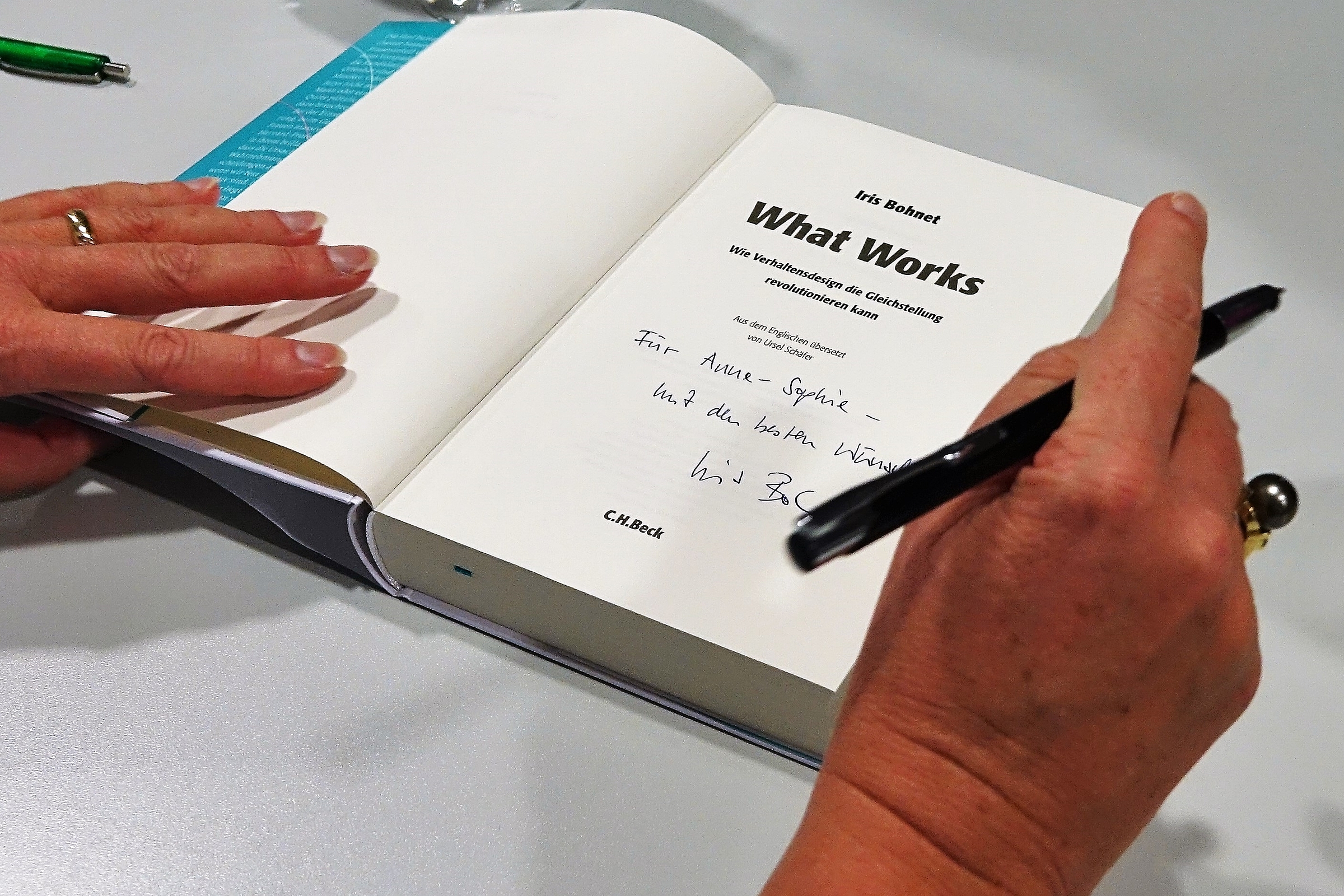 Bis auf den letzten Platz war der Hörsaal 9 besetzt, als Professorin Bohnet aufzeigte, warum wir Menschen Dinge falsch respektive verzerrt wahrnehmen, obwohl wir das Gefühl haben, objektiv zu sein. Die Antwort auf dieses Dilemma liegt nicht in der Anpassung der Frauen an männliche Verhaltensmuster oder im Apell an unsere Objektivität. Die Wahrnemung kann nicht überlistet werden. Aber Bohnet ist überzeugt, dass man die Spielregeln ändern kann, um objektiver entscheiden zu können. Dies ist die revolutionäre Botschaft ihres preisgekrönten Buchs "What Works - Wie Verhaltensdesign die Gleichstellung revolutionieren kann." Das Buch wurde im Anschluss verkauft und von der Autorin persönlich signiert.