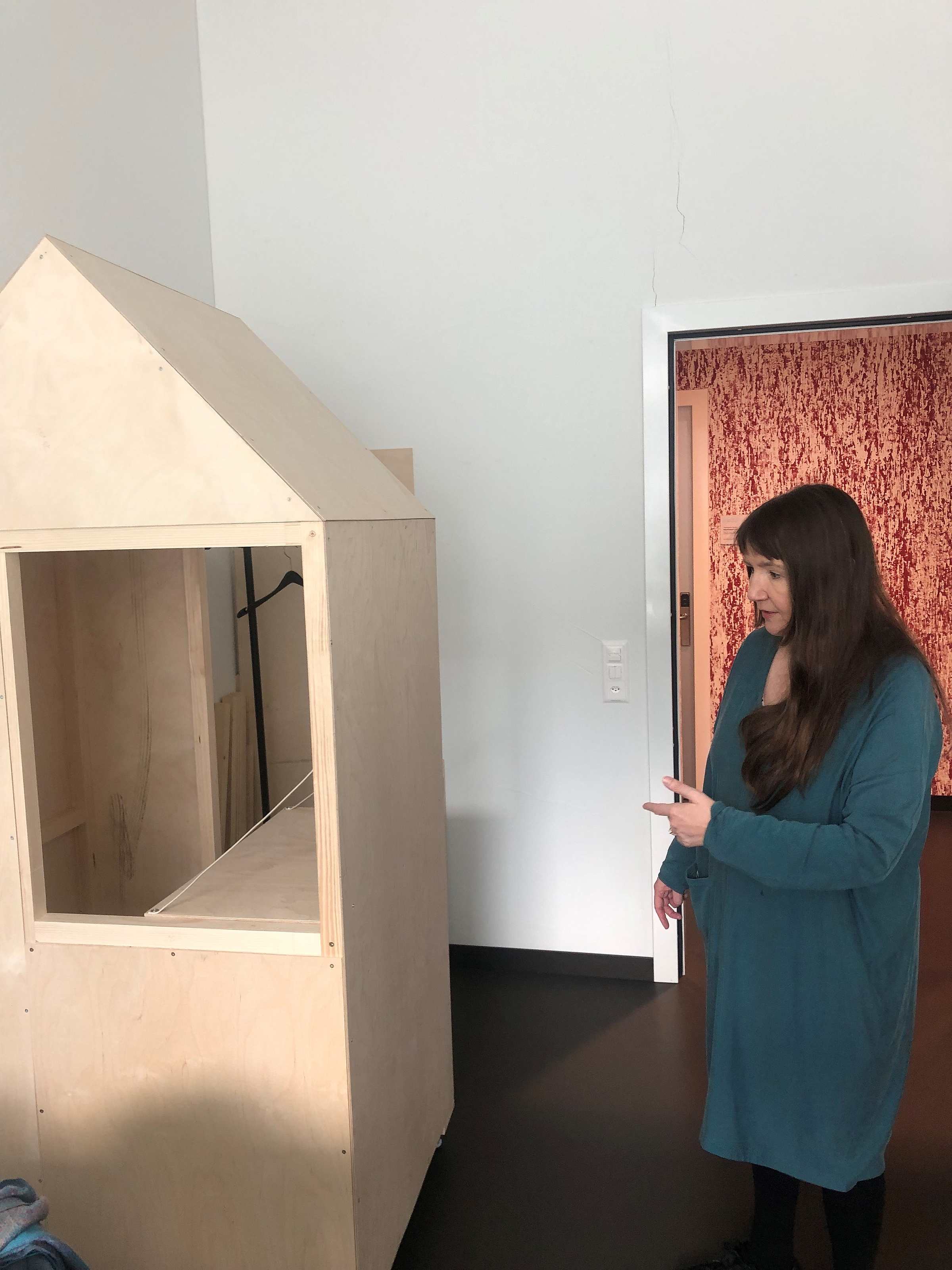 Schnell war klar, dass wir eine Raumintervention bauen würden, genauer gesagt das berühmte „1 SQM-House“ des Architekten Van Bo le Mentzel: Ein transportables Hüsli, das einen Quadratmeter groß ist und sowohl stehend als auch liegend nutzbar ist. Es kann die Umwelt verändern, in die es gestellt wird, und es kann die Menschen verändern, die darin sind.