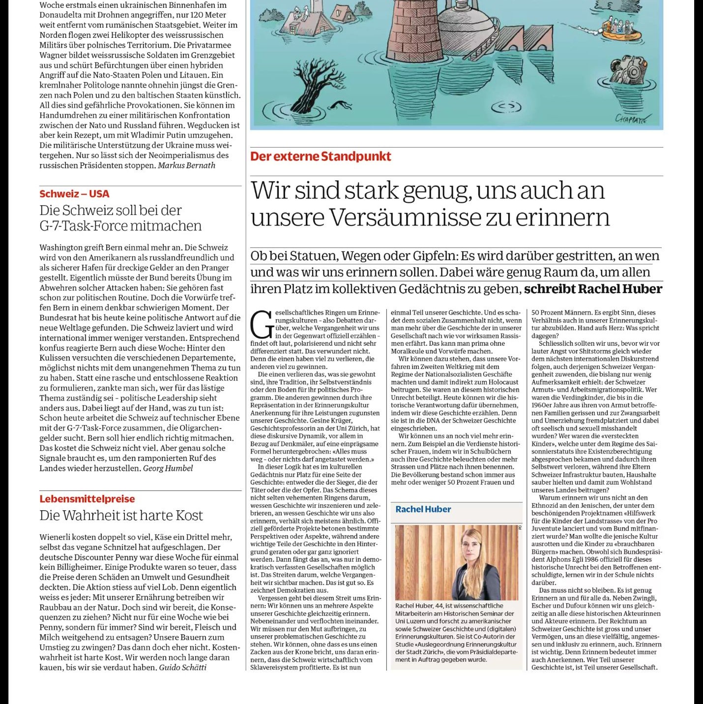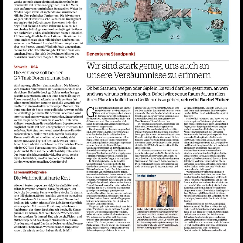 Rachel Huber schreibt in ihrem Gastbeitrag in der NZZ am Sonntag vom 6. August über umkämpfte Schweizer Erinnerungskulturen und darüber, dass es im kollektiven Gedächtnis eigentlich Raum für alle historischen Akteurinnen und Akteure hat – auch für bislang nicht erinnerte.
