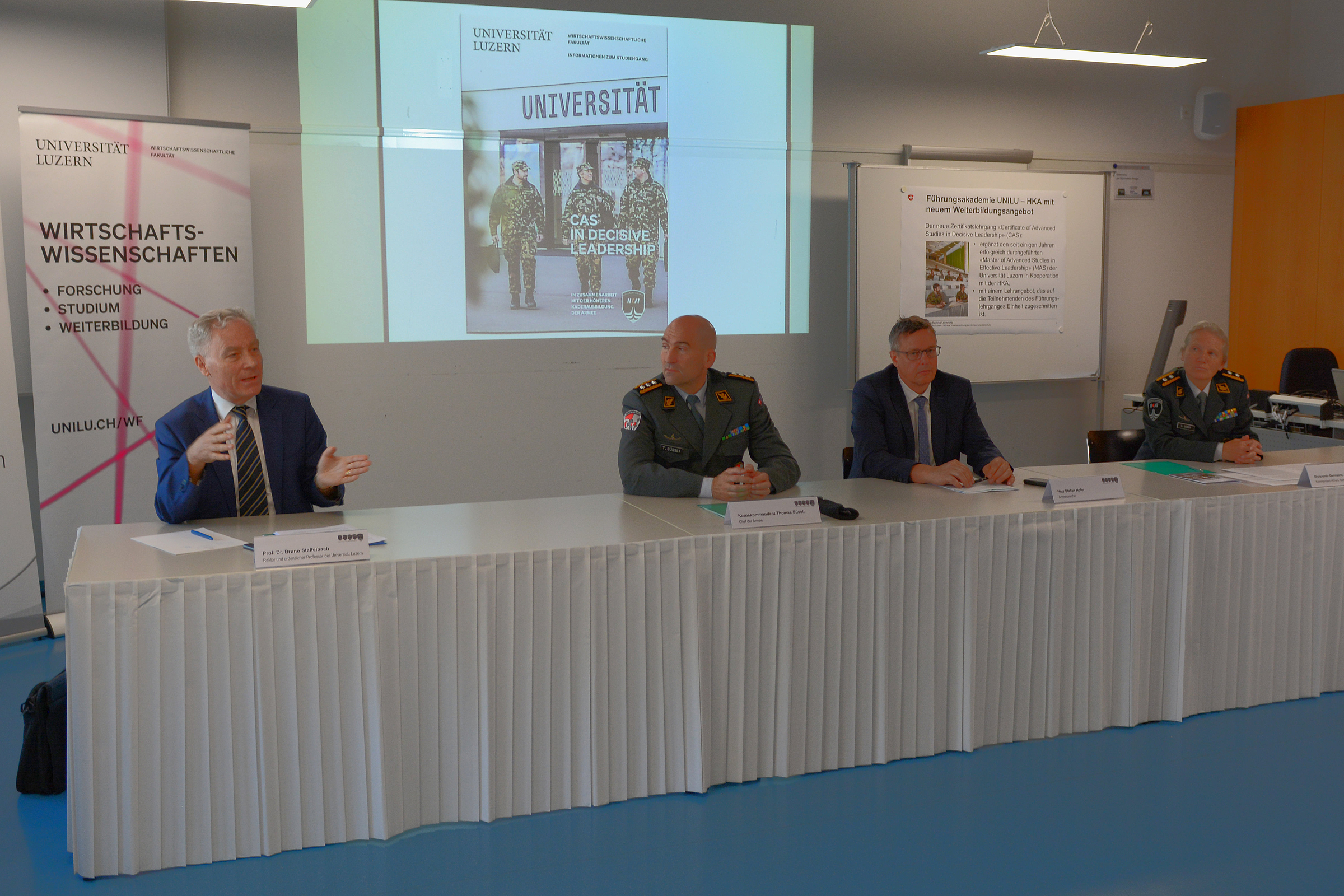 Zugführerinnen und Zugführer der Schweizer Armee, die das Kommando über eine Einheit – meist eine Kompanie – übernehmen wollen, müssen an der Zentralschule in Luzern den vierwöchigen Führungslehrgang Einheit absolvieren. Neu können Teilnehmende, die bereits über einen Hochschulabschluss verfügen, in diesem Rahmen ein «Certificate of Advanced Studies (CAS) in Decisive Leadership» erwerben. Der Zusatzaufwand dafür beträgt lediglich fünf Halbtage, wie an der Präsentation des Lehrgangs durch Prof. Dr. Bruno Staffelbach, Rektor und Professor für Betriebswirtschaftslehre an der Universität Luzern, Korpskommandant Thomas Süssli, Chef der Armee, und Divisionär Germaine Seewer, Kommandant der Höheren Kaderausbildung der Armee (HKA) am Mittwoch in Luzern hervorgeht. Die 13 ECTS-Punkte, welche mit dem Abschluss erworben werden, können vollumfänglich an den Lehrgang «Master of Advanced Studies (MAS) in Effective Leadership», der ebenfalls von der Universität Luzern in Kooperation mit der HKA durchgeführt wird, angerechnet werden.