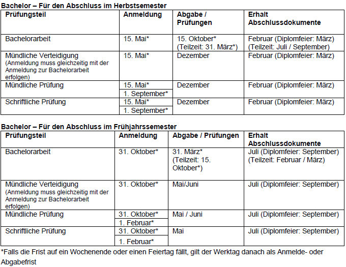 Um Ihr Studium abzuschliessen, müssen die ausstehenden Studienleistungen zu den untenstehenden Fristen vollumfänglich erfüllt und in Ihren Studienleistungen verbucht sein.