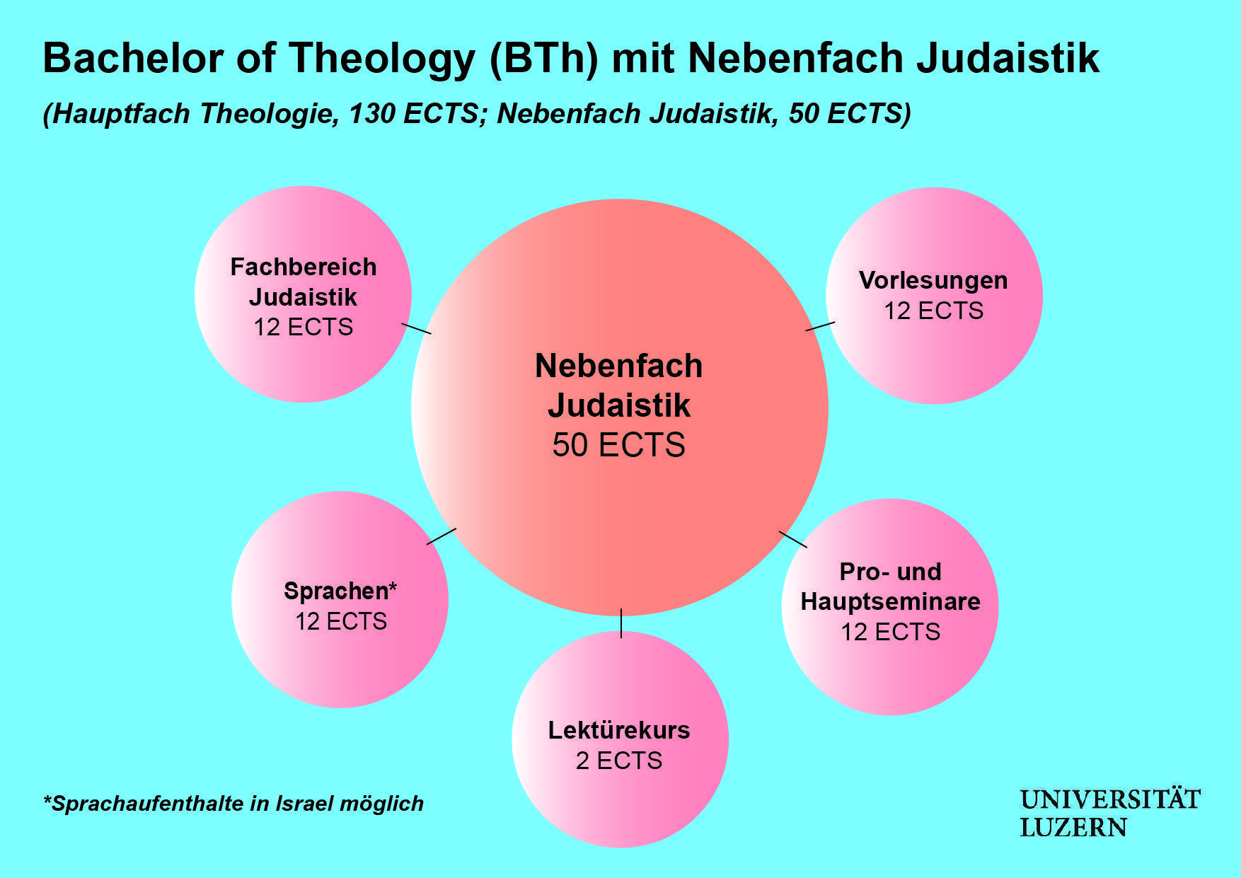 Judaistik ist integraler Bestandteil des Vollstudiums Theologie und des Hauptfachs Theologie. Wer sich mit diesem Fachgebiet vertiefter befassen möchte, kann Judaistik als Nebenfach im Rahmen eines Hauptfach-Nebenfach-Studiums studieren.