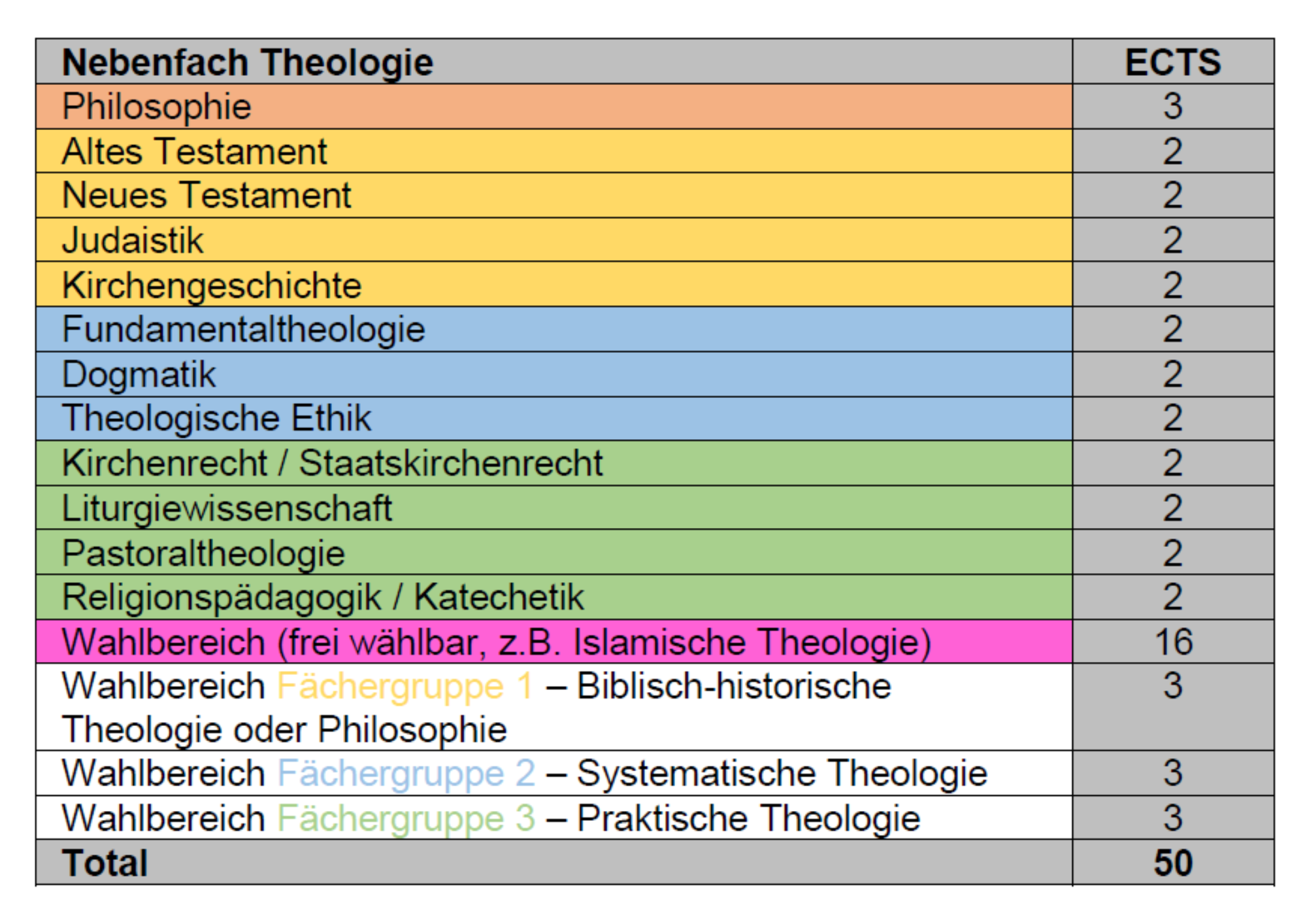 Das Nebenfach Theologie kann sowohl für das Bachelor- wie auch für das Masterstudium gewählt werden. Für den Abschluss des Nebenfachs sind 50 Kreditpunkte (ECTS) nachzuweisen, die sich im Bachelor bzw. Master wie folgt auf die verschiedenen Fächer verteilen: