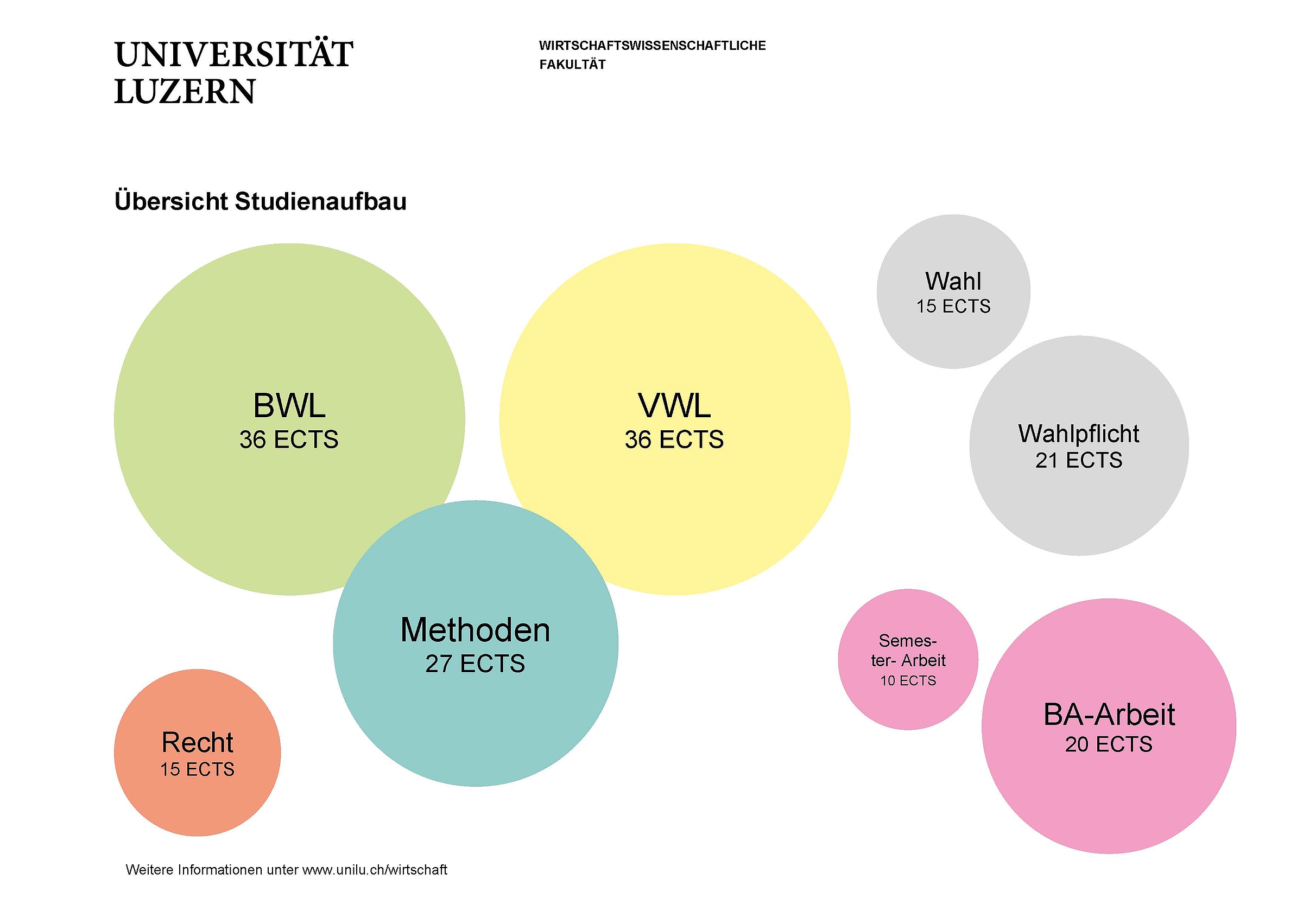 An der Universität Luzern erwerben Sie Kenntnisse in Betriebswirtschaftslehre (BWL) und Volkswirtschaftslehre (VWL) zu gleichen Teilen, um sich fundiert mit beiden Teilbereichen auseinanderzusetzen. Diese werden ergänzt durch Methodik-Kurse wie Mathematik und Statistik. In den rechtswissenschaftlichen Veranstaltungen werden Themen wie Wirtschaftsrecht oder Wirtschaftsstrafrecht behandelt.