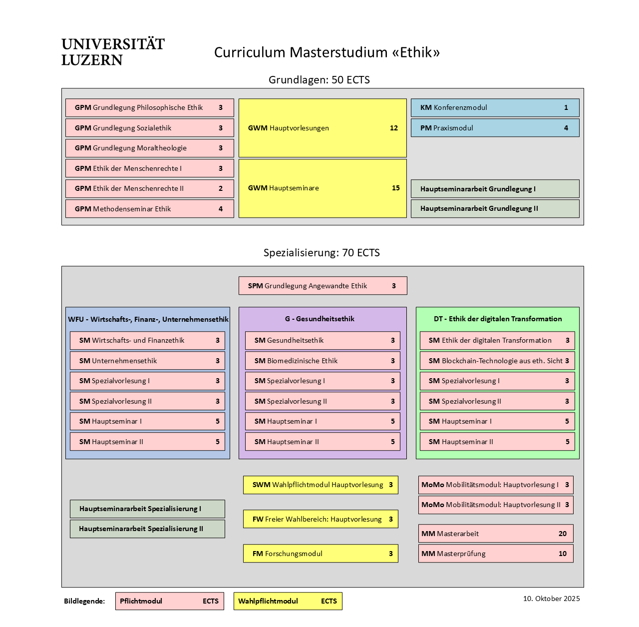 Das Masterstudium «Ethik» umfasst 120 ECTS Credits (Cr). Es gliedert sich in zwei Studienabschnitte: