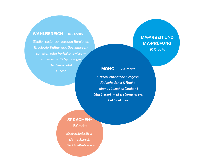 Das Masterstudium in Jüdisch-Christlicher Beziehungen umfasst 120 ECTS (European Credit Transfer System), was einer Regelstudienzeit von 4 Semestern (2 Jahren) entspricht.