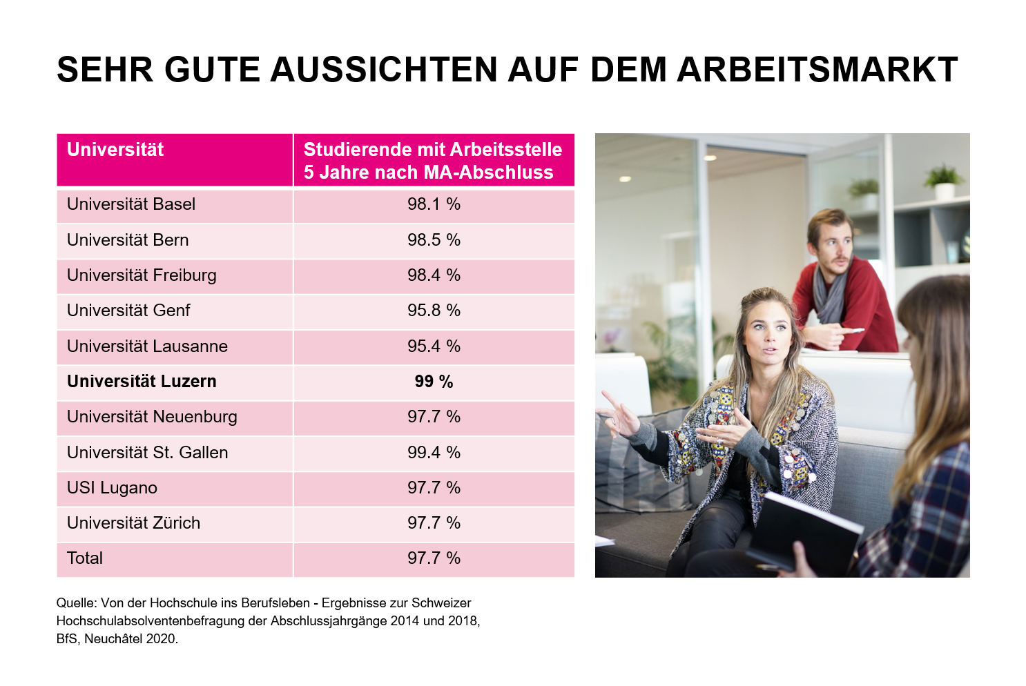 Mit dem breiten Wirtschaftsstudium an der Uni Luzern steht Ihnen die Welt offen. Als Absolventin oder Absolvent der Wirtschaftswissenschaften halten Sie Kaderpositionen in nationalen und internationalen Unternehmen inne, steigen ins Consulting ein oder forschen an Universitäten sowie in Think-Tanks zu Wirtschaft und Politik. Auch Führungspositionen in der Bundes- und Kantonsverwaltung sowie in NGOs und internationalen Organisationen sind möglich. Natürlich können Sie auch den Schritt in die Selbstständigkeit wagen und Ihr eigenes Unternehmen gründen. Nach dem Studium warten in jedem Fall gute Chancen auf dem Arbeitsmarkt auf Sie (siehe Bild). Bereits in kürzester Zeit hat sich das Masterstudium in Wirtschaftswissenschaften etabliert, was sich auch in der Lohnstatistik des Bundesamts für Statistik zeigt: