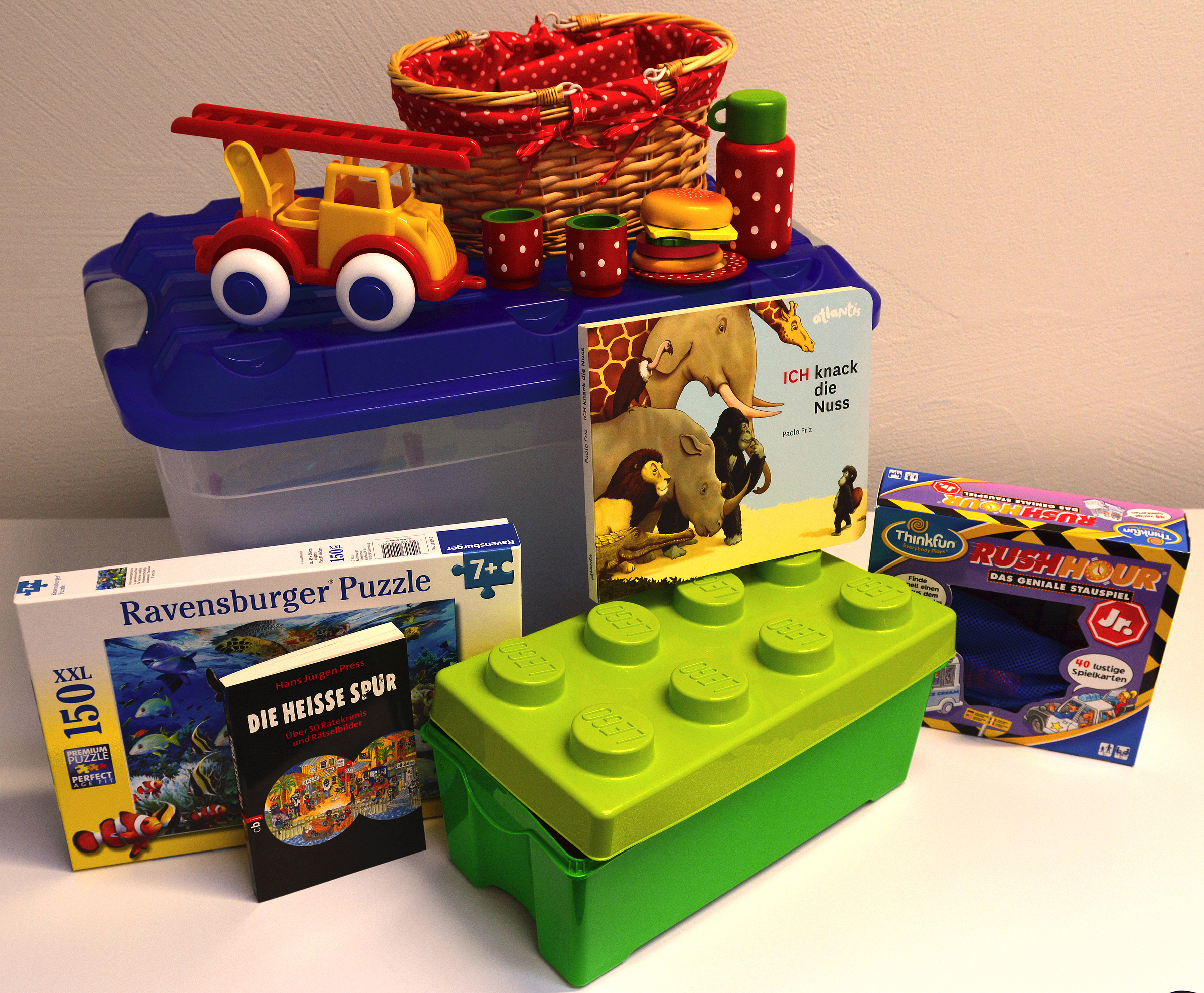 Es stehen drei Spielkisten mit einem Spielangebot für Kleinkinder (ca. 1-3 Jahre), Kinder zwischen 4 und 7 Jahre sowie ältere Kinder zur Verfügung. Auf Wunsch, kann eine Kiste auch mit Material aus anderen Kisten ergänzt werden.