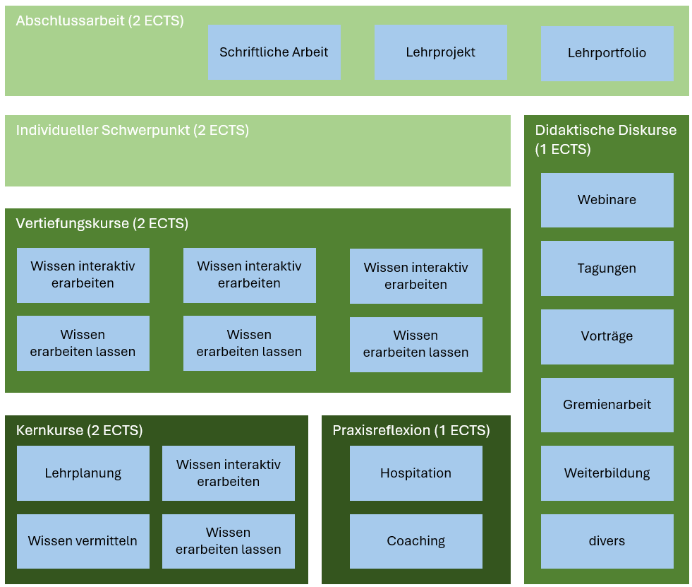 - Didaktische Diskurse (1 ECTS): In freier Wahl besuchen die Teilnehmenden diverse Angebote wie Webinare, Tagungen, Vorträge, Mitarbeit in einschlägigen Gremien. Insgesamt müssen 30 Stunden besucht werden, der Nachweis erfolgt über eine selbst geführte Liste.