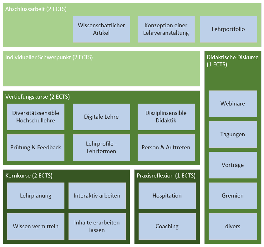 - Vertiefungskurse (2 ECTS): Es gibt 6 thematische Vertiefungsmodule, von denen zwei in freier Wahl belegt werden müssen. Jedes Modul besteht aus drei ganztägigen Kurstagen mit individueller Vorbereitung im Umfang von etwa zwei Stunden. Die Kurse lauten: Diversitätssensible Hochschullehre, Prüfung & Feedback, Digitale Lehre, Lehrprofile - Lehrformen, Disziplinsensible Didaktik, Person & Auftreten.