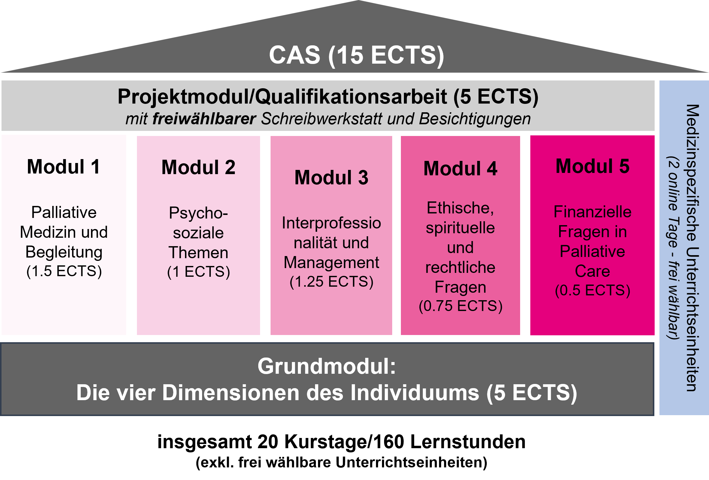 Das CAS Palliative Care ist modular aufgebaut und ermöglicht eine vertiefte Auseinandersetzung mit zentralen Aspekten der spezialisierten Palliative Care. Vermittelt werden Kompetenzen in den Bereichen Medizin, Pflege, Psychologie, Ethik, Spiritualität, Kommunikation, Recht und Management. Ergänzend werden auch Themen wie Finanzierung und Tarifierung behandelt.