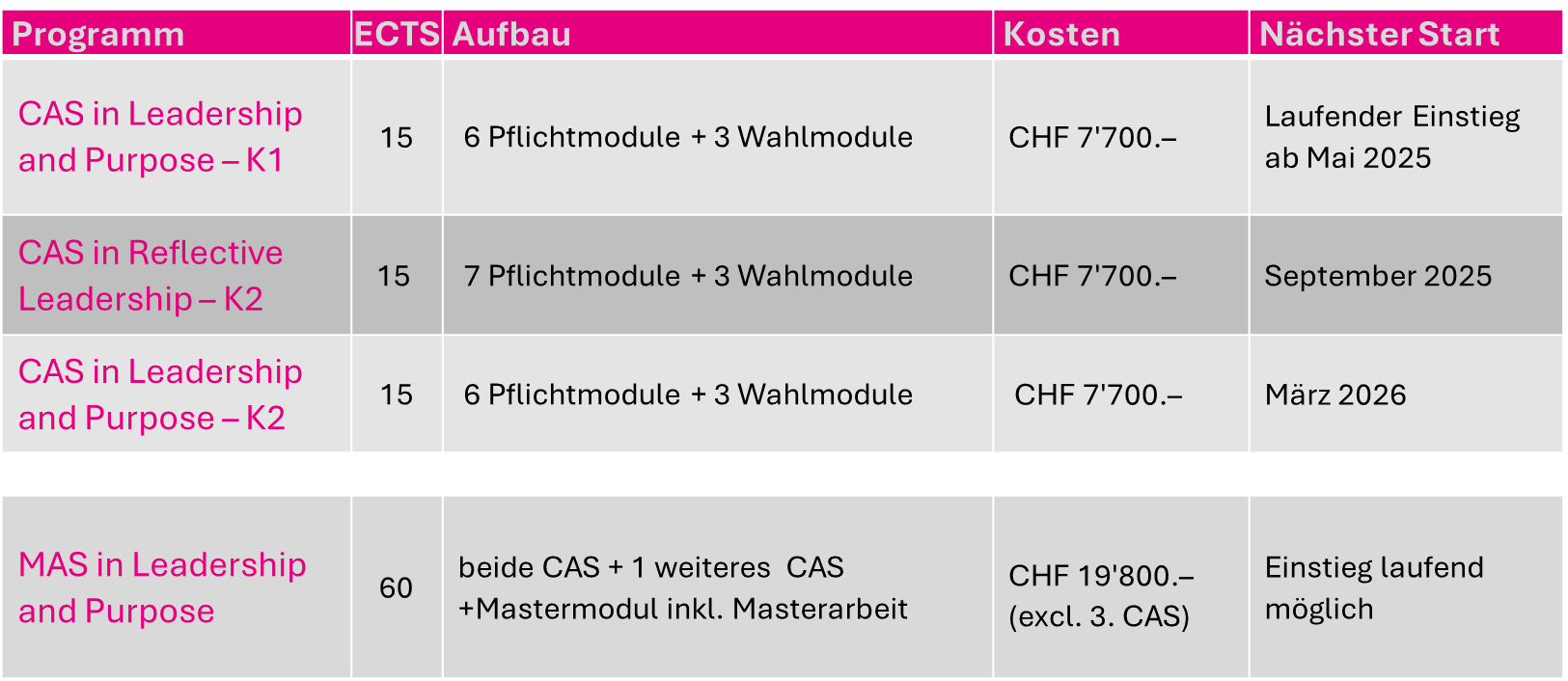 Der MAS Leadership & Purpose beinhaltet folgende drei Zertifikatslehrgänge (Certificate of Advanced Studies, CAS)