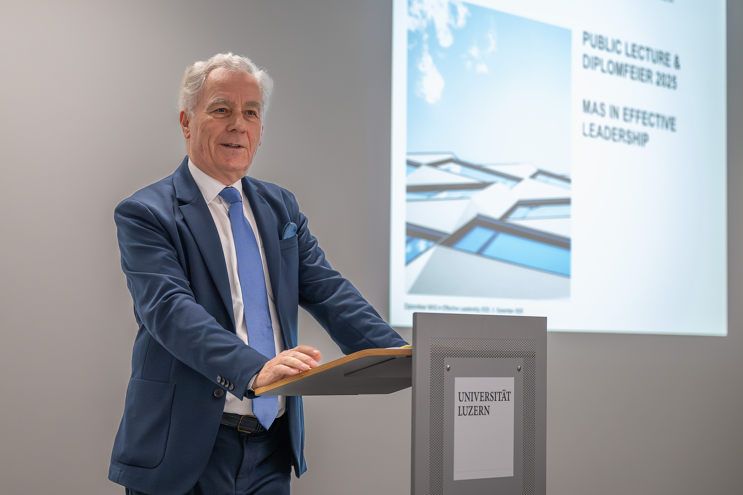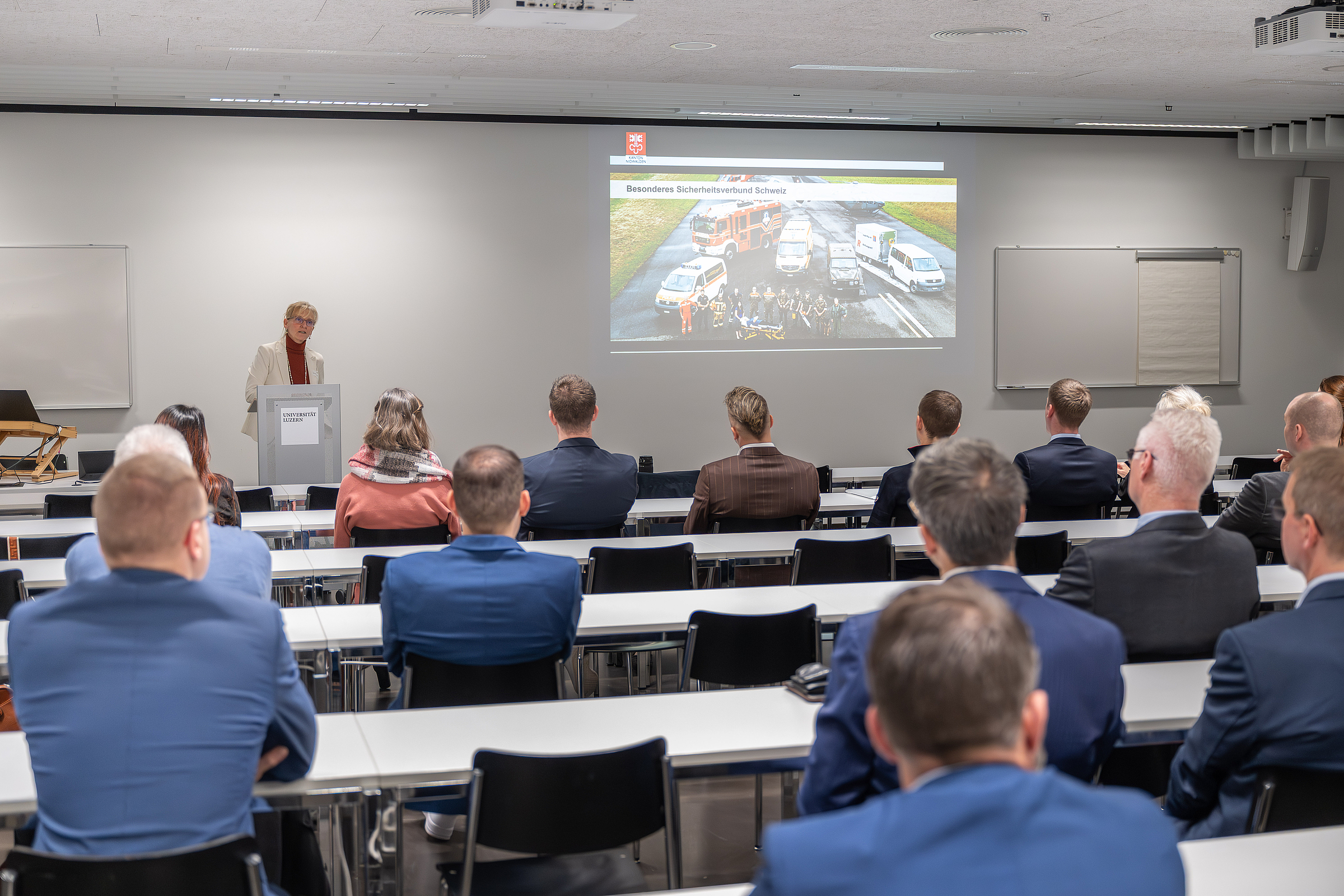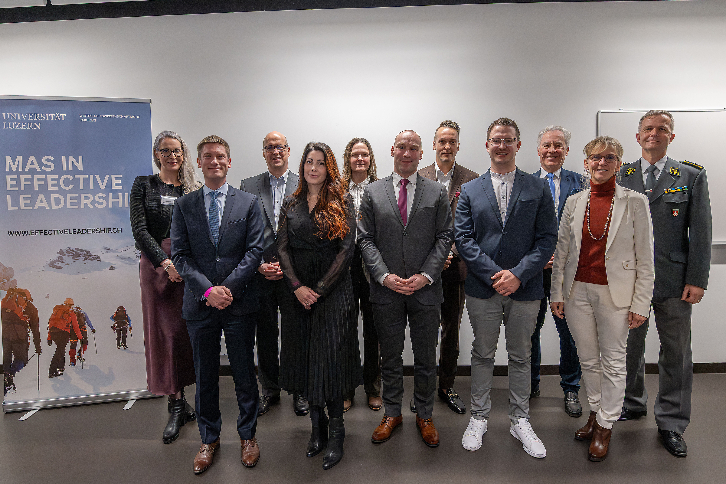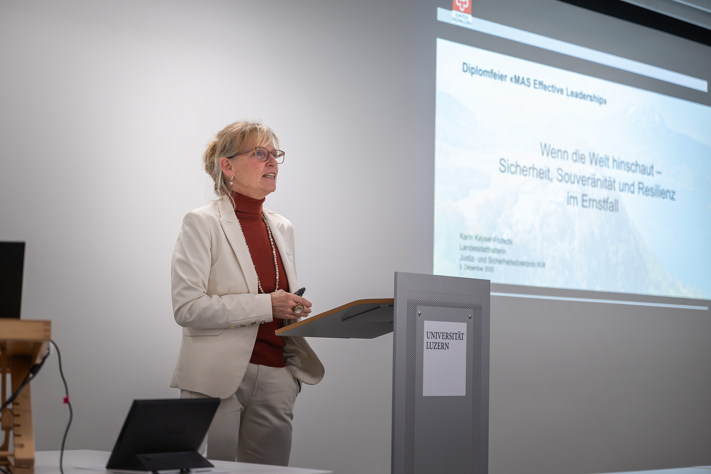 Am 5. Dezember 2025 wurden unsere Absolventinnen und Absolventen des MAS in Effective Leadership für ihren erfolgreichen Abschluss an der Universität Luzern gewürdigt. Nach der herzlichen Begrüssung durch Prof. Dr. Bruno Staffelbach konnten wir Karin Kayser-Frutschi, Justiz- und Sicherheitsdirektorin des Kt. NW und Präsidentin der KKJPD, bei ihren spannenden Ausführungen zum Thema “Wenn die Welt hinschaut - Sicherheit, Souveränität und Resilienz im Ernstfall” lauschen. Dies hat uns eindrücklich gezeigt, wie wichtig es ist, dass die verschiedenen Teams der Blaulichtorganisationen unter einer guten Führung exzellent funktionieren und Höchstleistungen erbringen können. Ein herzliches Dankeschön geht auch an unsere Absolventin Natalie Andreoli für ihre bemerkenswerte Absolvierenden-Rede, welche uns berührt und bestärkt hat.